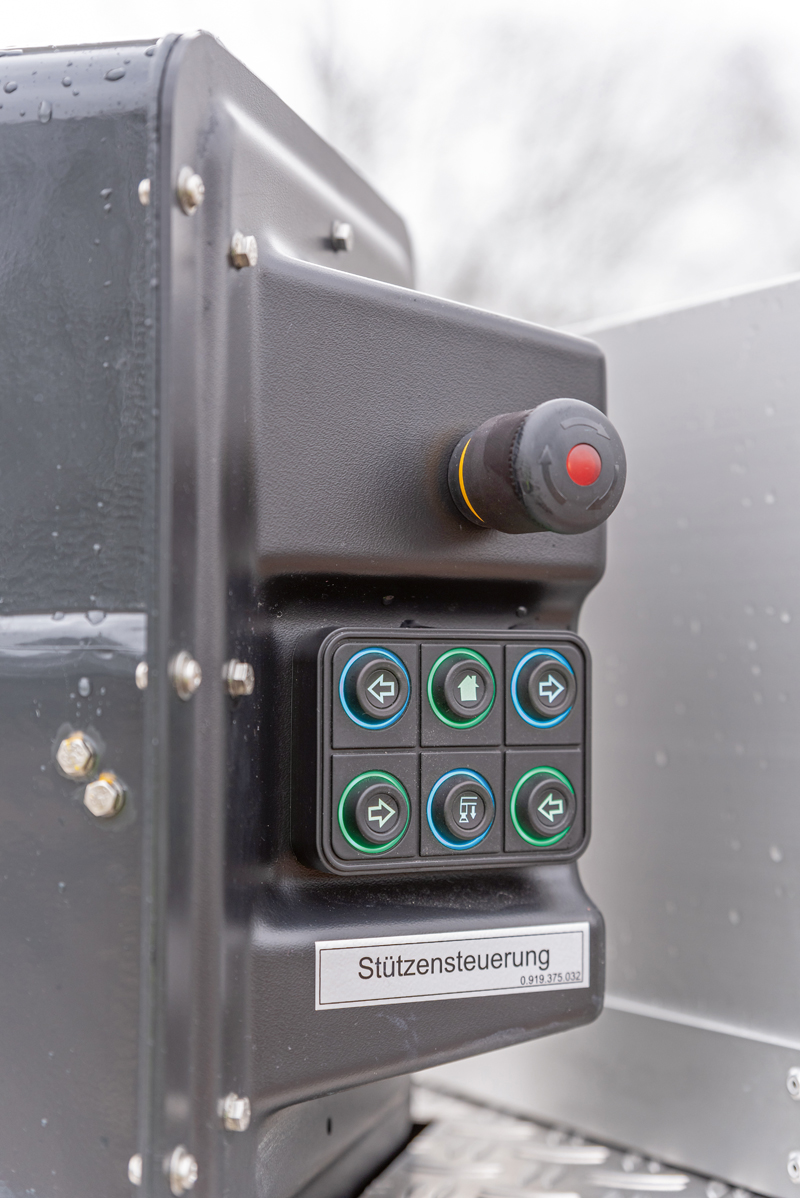 Ebenso »am Boden« will der Steiger T 300 XS Neues bieten. So kommt in einer T-Baureihe die neue Stützenbedienung serienmäßig zum Einsatz, die sich laut Anbieter in der TB-/TBR-Reihe hoher Beliebtheit erfreut. Die Steuerung ist auf Augenhöhe am Chassis integriert und bietet neben den Abstützvarianten und Komfortfunktionen eine praktikable Abstützung der Maschine am Fahrzeug. Gut erkennbare Schalter, die ihre Farbe verändern können, sollen den Bediener der Maschine nie im Unklaren lassen. Die Stützensteuerung aus der Baureihe TB/TBR kommt auch beim Steiger T 300 XS zum Einsatz. Die Knöpfe zeigen dem Bediener durch unterschiedliche Farben den Status an.
