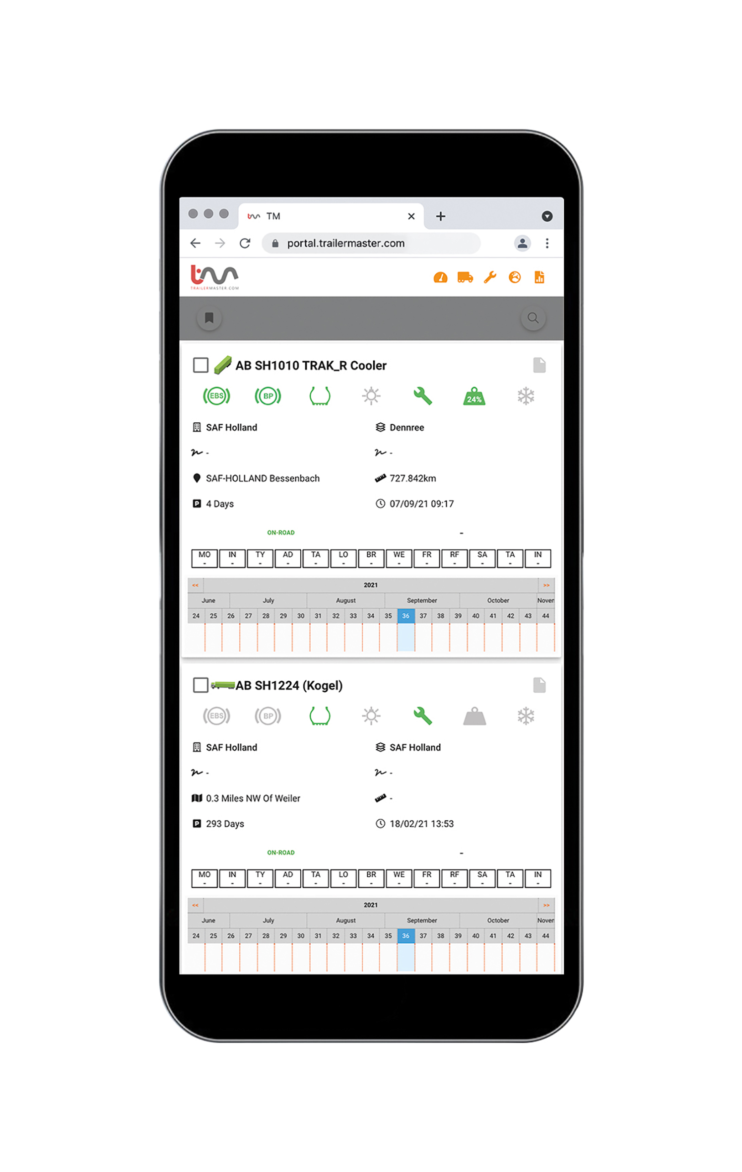 Das TrailerMaster Webportal bereitet die synchronisierten Bewegungs- und Fahrzeugdaten übersichtlich auf, egal ob an PC, Notebook, Tablet oder auf dem Smartphone. So sieht der Spediteur den Zustand seiner gesamten Flotte auf einen Blick und kann Trailer- und Transportprozesse dokumentieren. Die Fahrzeug- und Bewegungsdaten aktualisieren sich automatisch, sodass alle Ereignisse zentral über-wacht und gesteuert werden können. Über das Fleet Desk verwaltet der Fuhrparkmanager alle Fahrzeu-ge – von der Zulassung über eventuelle Vermietungen bis hin zur Stilllegung.