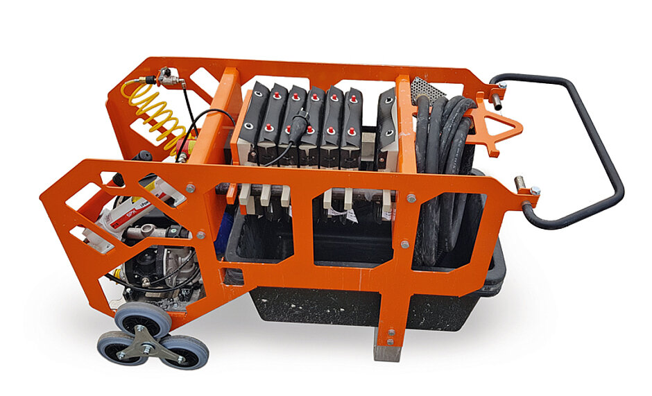 Mit ihrem pneumatischen Antrieb und 7 bar Luftdruck bietet die platzsparende Schlammpresse CSL500 eine Recyclingkapazität von 500 l/h. Der Bauschlamm wird dabei angesaugt und läuft anschließend durch sieben Filterplatten, deren Kapazität zwischen 1,25 l bis 7,5 l variiert. Übrig bleiben das für die Entsorgung freigegebene, gereinigte Wasser sowie das fest komprimierte Sediment, das in zwei je 90 l fassenden Behältern zurückbleibt und seinerseits getrennt entsorgt werden kann. t