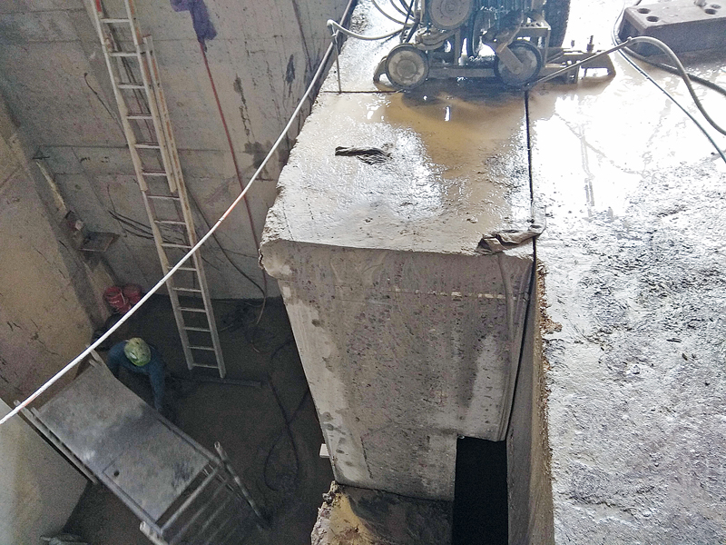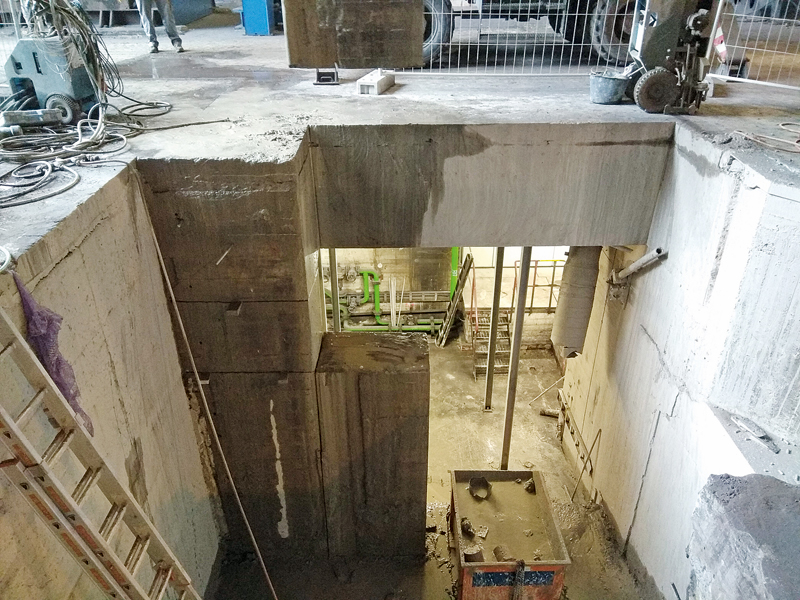 Es fielen insgesamt 125 m² Schnittflächen an, wobei die Standzeit des Seils 1,5 m²/m bis 2 m²/m betrug. Insgesamt wurden 9 500 cm² Stahl gebohrt und gesägt. Unterm Strich demontierten die Facharbeiter auf der Baustelle 600 m³ Beton (Decken, Wände/Sohlen) und zerstemmten sie anschließend auf dem Außengelände.