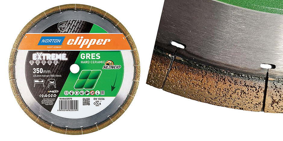 Damit sehr hartes und dickes Feinsteinzeug sicher und auch ohne hohe Rüstkosten getrennt werden kann, hat Norton Clipper die Extreme Gres Diamantscheibe entwickelt. Ihre 15 mm hohen, lasergeschweißten Segmente werden auf Basis der von Norton weiterentwickelten und patentierten iHD-Technologie hergestellt, welche Porosität in die Segmente bringt. Dank dieses Verfahrens trennt die Norton Clipper Extreme Gres Diamantscheibe extrem schnell bei unerreicht hoher Standzeit.