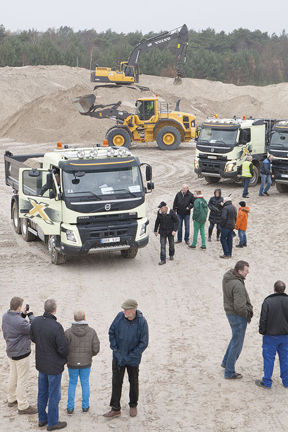 Swecon war mit einem Querschnitt an Baumaschinen von Volvo Construction Equipment vertreten. Neben der Radlader-Palette, die vom kompakten L30G über die Modelle L60G und L110G bis zum imposanten Großlader L180G reichte, standen auch ein Mobilbagger EW160D sowie der auf einem 10 m hohen Sandhügel hoch über dem restlichen Gelände thronende Raupenbagger EC250D zu Testzwecken bereit. Volvo Trucks steuerte sieben Baustellen-Lkw der neuesten FMX-Generation bei, die in verschiedensten Ausstattungsvarianten und Achskonfigurationen bereitstanden – vom leichten Zweiachser mit Dreiachs-Kippsattel über einen Allrad-Dreiachser und wendige Vierachser bis hin zum schweren Fünfachser.
