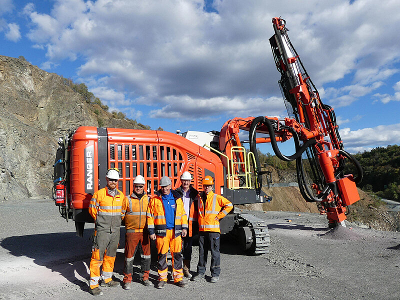Berge-Bohrist Andreas Soldan, Sandvik-Bohrgeräte-Vertriebsleiter Olaf Gruner und die Sandvik-Trainer Ralf Müller und Raoul Düsing treffen alle Vorbereitungen für den ersten Einsatz des Ranger DX900i. Eine Schlüsselrolle kommt Pauli Lindholm zu. Extra angereist vom Herstellerwerk in Finnland, kennt er als Sandvik-Spezialist die Maschine bisher am besten und aus erster Hand. Seine Aufgabe lautet: „train the trainer“, denn auch seine deutschen Trainerkollegen lernen den Neuling gerade erst in Aktion kennen. Für solche Situationen und die künftige Weitergabe von Wissen beinhaltet die neu konzipierte, ergonomische und komfortable ROPS/FOPS-Kabine des technisch hochentwickelten Bohrgerätes hinter dem Fahrersitz einen weiteren Ausbilderplatz.