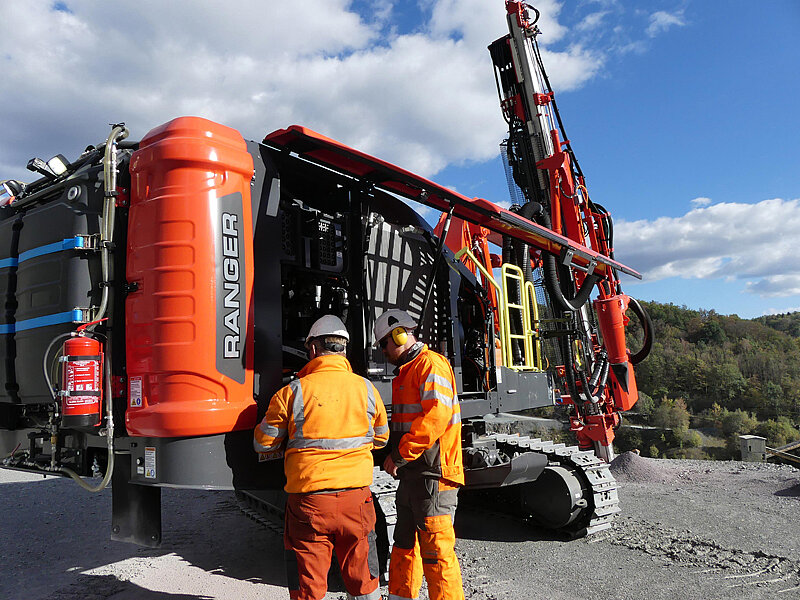 In bemerkenswerter Ruhe – dank der Zusammenarbeit mit dem Technischen Forschungszentrum Finnland VTT wurden die Geräuschemissionen in der neuen iCab-Kabine auf einen minimalen Pegel gebracht, den es für diese Art von Bohrgeräten so noch nie gegeben hat – erklärt der Ausbilder die neue Benutzeroberfläche und Bedienfelder des Touchscreens. Die bedienerfreundlichen Joysticks werden von allen Ranger DX900i-Neulingen schon beim Erstversuch im Probelauf richtig gehandhabt. Ausbilder Pauli hinter dem Maschinenführersitz zeigt sich schon in dieser frühen Phase mit dem Ergebnis sichtlich zufrieden. Schon wenige Tage später hat auch Bohrist Andreas Soldan ein vertrautes Verhältnis zum Ranger DX900i aufgebaut und schätzt seine Vorteile – zumindest was die Hardware betrifft. „Sein“ hydraulisches, auf Raupen selbstfahrendes Übertagebohrgerät mit flinkem automatischen Stangenwechsler wird auf Sicht beim Produktionsbohren in Steinbrüchen Großartiges leisten, soviel ist schon einmal klar, und es wird auch dann punkten, wenn die Berge-Mannschaft im Auftrag von Bauunternehmen an Infrastrukturmaßnahmen mit Bohr- und Sprengbedarf beteiligt ist.