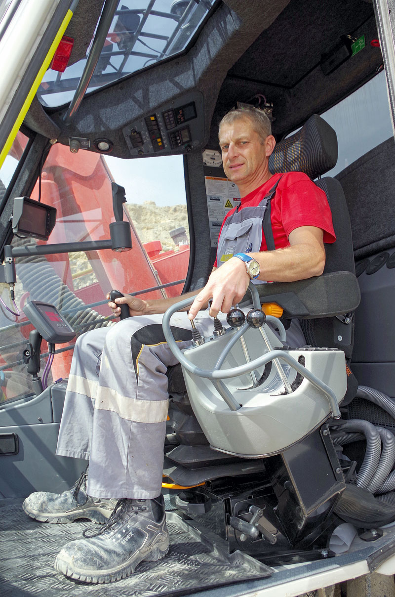 Im Steinbruch findet sich eine komplizierte Geologie mit engräumig wechselndem Einfallen von intensiv gestörten Schichten. Damit verbunden sind häufig Klüfte und brüchige Kanten auf den Abbausohlen. Der Ranger bietet als Alleinstellungsmerkmal einen um bis zu 180° drehbaren Oberwagen. Eine Funktion, die Bernhard Pfohl in der täglichen Praxis nutzt: »Ich kann über das Schwenken der Anlage ein erhebliches Arbeitsfeld bis zu 26 m² abdecken ohne im Gefahrenbereich nahe der Abrisskanten langwierig rangieren zu müssen. Dazu lässt sich ein deutlich größerer Abstand zum Abgrund halten und ich habe trotzdem alle Bohrpunkte optimal im Blickfeld.«