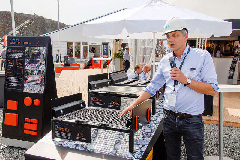 Eine »perfekte Kombination« von Vorteilen verschiedener Siebmedien repräsentieren die neu entwickelten Sandvik-Siebmedien, für die stellvertretend das neue Produkt WX6500 steht, das auf der Steinexpo seine Weltpremiere feierte. Es vereint laut Sales-Manager Ralf Henning die Siebgenauigkeit eines Drahtgewebes für Trennschnitte von 2 mm bis 32 mm Korngröße mit den Vorteilen eines Gummisiebbelages. Neben einer bis zu zehnfach höheren Haltbarkeit gegenüber herkömmlichen Drahtgeweben würden Anwender zudem die unkomplizierte Handhabung der leichten und flexiblen Siebmedien zu schätzen wissen. In der Anwendung sprechen laut Sandvik der maximale Anteil der offenen Siebfläche, höchste Siebgenauigkeit und überzeugende Siebleistung eine deutliche Sprache, die Praktiker mit besonders hohen Anforderungen an die erzeugte Produktqualität anspricht. Das Siebmedium WX6500 sei in diesem Punkt einem Drahtgewebe absolut ebenbürtig, verfüge aber über weitere positive Eigenschaften, die Drahtsiebe nicht vorzuweisen hätten. Beispielsweise werde der Nutzwert deutlich erhöht, indem der neuartige Siebbelag Steckkorn reduziert und Materialanhaftungen vermindert. Der verschleißresistente Siebbelag gewährleiste die Erzeugung eines konstanten Qualitätsproduktes über die gesamte Einsatzzeit hinweg. Das erhöhe die Produktionssicherheit.