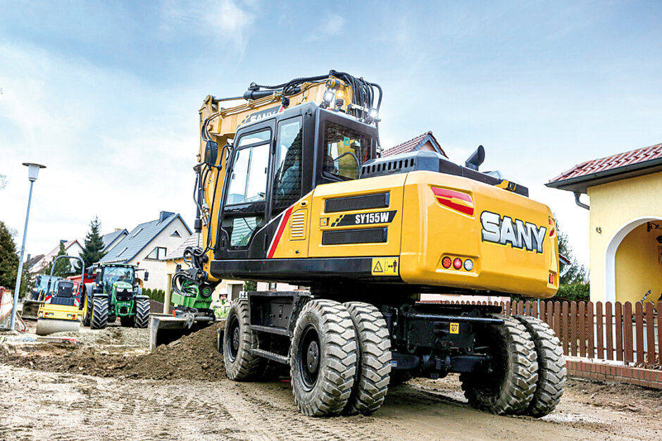 Der 15-t-Mobilbagger SY155W will im Tiefbau, auf Stadtbaustellen oder im GaLaBau durch seine Flexibilität auf Rädern überzeugen. Kurze Strecken von einer Baustelle zur nächsten lassen sich problemlos überbrücken. Bewährt hat sich auch die Hydraulikanlage, die beispielsweise die Umschaltung vom Stiel auf den Löffelzylinder, die Vorbereitung des Schnellwechslers und die beiden zusätzlichen Hydraulikkreisläufe umfasst. Speziell für europäische Anforderungen hat Sany den Arm als Verstellausleger umgesetzt.