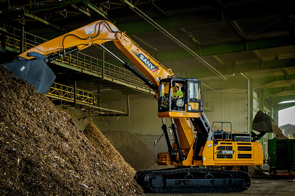 Zwei der wichtigsten Anforderungen bei der Beladung von Schiffen mit Schüttgut sind die hohe umzusetzende Menge und die große Breite der zu beladenden Fläche. Die Holzschnitzel müssen zudem nicht nur schnell und gleichmäßig verteilt, sondern auch über die gesamte Ladefläche verdichtet werden. Dazu wurde der SY500H auf Hochlöffelbetrieb umgerüstet und auch eine Leichtgutschaufel mit einer Kapazität von 17,5 m³ angebaut. Für die erforderliche Reichweite von 12 m wurden Ausleger und Stiel verlängert. Um die Stabilität bei dieser Reichweite und Traglast zu gewährleisten, erfolgte zudem eine Erhöhung des Heckgewichts. Daraus resultierte auch ein Plus des Maschinengewichts auf insgesamt rund 60 t.