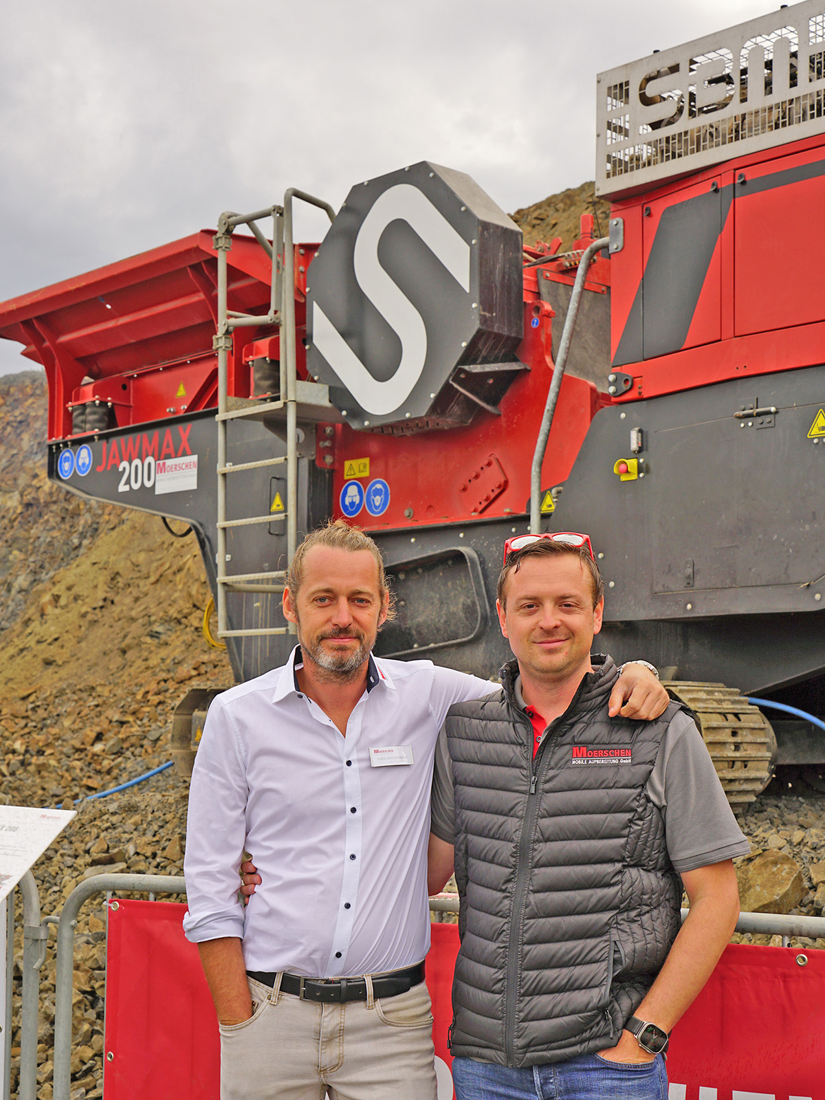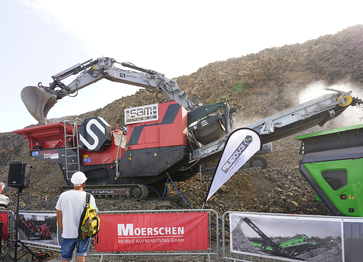 „Auf der Steinexpo führte kein Weg an SBM vorbei," so das zufriedene Fazit von Helmut Haider Vertriebsleiter Mobile Aufbereitung des österreichischen Herstellers. „Gleich drei unserer deutschen Händler präsentierten mit Mobil-Demos und weiteren Exponaten die ganze Bandbreite unseres Angebots für Naturstein und Recycling." Unterstützt von den SBM-Produktspezialisten zeigten Moerschen Aufbereitung (D-West), Fischer-Jung (D-Ost) und Kurz Aufbereitungsanlagen (D-Süd) insgesamt sechs Anlagen, wobei der Fokus auf den hochmobilen diesel-elektrischen Jawmax -Backenbrechern und Remax-Prallmühlen von knapp über 20 bis rund 50 t Einsatzgewicht lag.