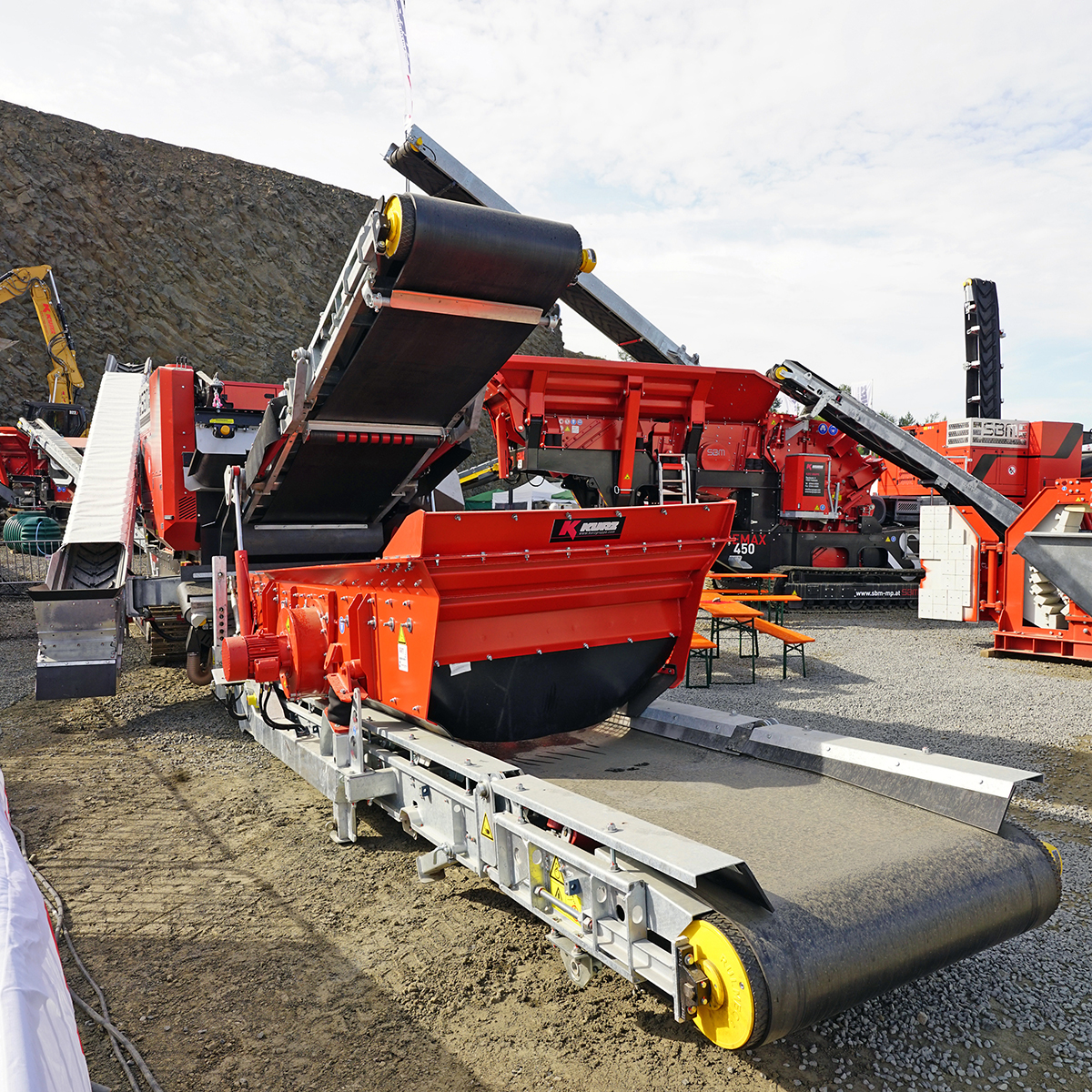Die ständige Weiterentwicklung der SBM-Technologie präsentierte Kurz Aufbereitungsanlagen. Erstmals wurde mit dem Jawmax 300 DD ein raupenmobiler Backenbrecher mit Doppeldeck-Nachsieb und Überkornrückführung gezeigt. Insgesamt drei Endprodukte lassen sich in einem Durchgang mit der Anlage erzeugen, wodurch sich das Einsatzspektrum und die Produktivität des 300-t/h-Brechers nochmals deutlich vergrößern lassen. Eine höhere Wertschöpfung gerade bei siebschwierigen Materialien verspricht auch das neue verlängerte Nachsieb des Remax 300 max: Insgesamt 6 m² Siebfläche verbessern die Austragsleistung im Feinkornbereich 0 – 11 mm, was die Einsatzmöglichkeiten der Prallmühle mit einem Einlauf von 1040x700 mm unter anderem im Asphalt, aber auch bei anderen Recycling-Materialien deutlich erweitert.