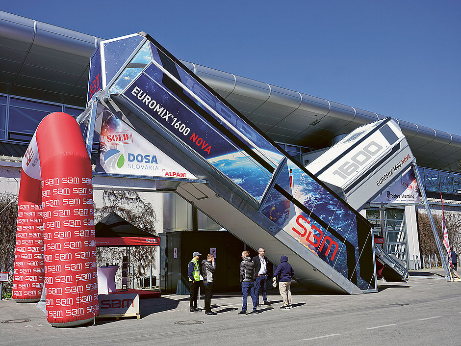 Ausgerüstet mit einem Doppelwellenmischer »DKX« des Typs »1,67« von BHS mit einem Festbetonausstoß von 80 m³/h, eignet sich die Mischanlage laut SBM für kleinere bis mittlere Baustellen mit einem Tagesbedarf von bis zu 800 m³ Beton oder Flüssigböden für Verfüllungen. Aufgrund eines effizienten »Winterpakets« arbeitet die »Euromix 1600 Nova« ganzjährig und kann damit auch als temporäre Ergänzung stationärer Werke in der Produktion hochwertiger Rezepturen – einschließlich Sonder- und Recyclingbetone – oder als platzsparende Dauerlösung in der Fertigteil-Produktion eingesetzt werden. »Insbesondere die große Flexibilität der ›Euromix‹-Technologie quer durch alle Leistungsklassen hat viele Besucher überzeugt«, bewertet Ernst Stöttinger, SBM-Vertriebsleiter Beton, das große Interesse an dem insgesamt sieben Modelle umfassenden Anlagenprogramm mit Stundenleistungen von 80 bis 175 m³ bzw. bis 300 m³/h in kombinierter »Duo«-Version.