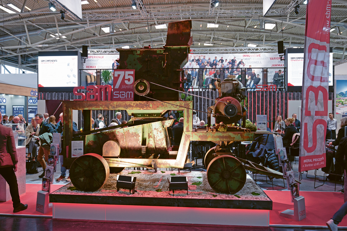 Der heimliche Star war laut vieler Standbesucher eine voll funktionsfähige, dafür aber kräftig in die Jahre gekommene radmobile Brechanlage des Typs »SAP 1«. Sie sollte, wie SBM mitteilt, den Bogen zum 75-jährigen Bestehen des Unternehmens spannen. Gebaut wurde das Schmuckstück im Jahr 1960 im heutigen SBM-Produktionswerk Liezen, wo sie laut SBM mit ihrem Dreideck-Aufbausieb bereits damals eine hochflexible Lösung zur Produktion von Straßenbaustoffen darstellte.