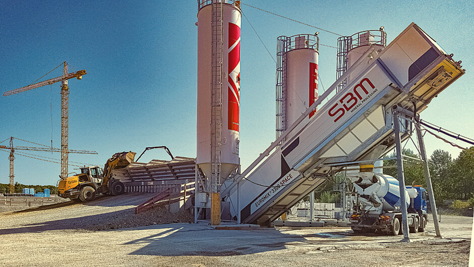 Der aus 18 Maschinen bestehende »Fuhrpark« von Pfeiffer Bau, der bereits fünf mobile Betonmischanlagen der Euromix-Baureihe beinhaltete, wurde für die Großbaustelle am künftigen Bildungscampus in München nochmals erweitert. So lieferte SBM im Frühjahr 2020 eine Euromix 3300 Space, eine mobile Restbetonaufbereitungsanlage und eine mobile Heizanlage. Die modulare Kombination der drei Anlagen ermöglicht einen reibungslosen und witterungsunabhängigen Ablauf der Bautätigkeiten. Durch die Lieferung »aus einer Hand« gewährleistet SBM eine optimale Abstimmung der Schnittstellen – die Anlagen agieren als ein in sich geschlossener Kreislauf. Insbesondere die Restbeton-Recycling-Anlage kann als wirtschaftlich wichtige und umweltschonende Ergänzung zur Betonmischanlage verstanden werden. Hier wird das benützte Waschwasser für den Fahrmischer und die Reinigung des Mischers aufbereitet und die gewonnenen Rückstände werden der Betonproduktion wieder zugeführt.