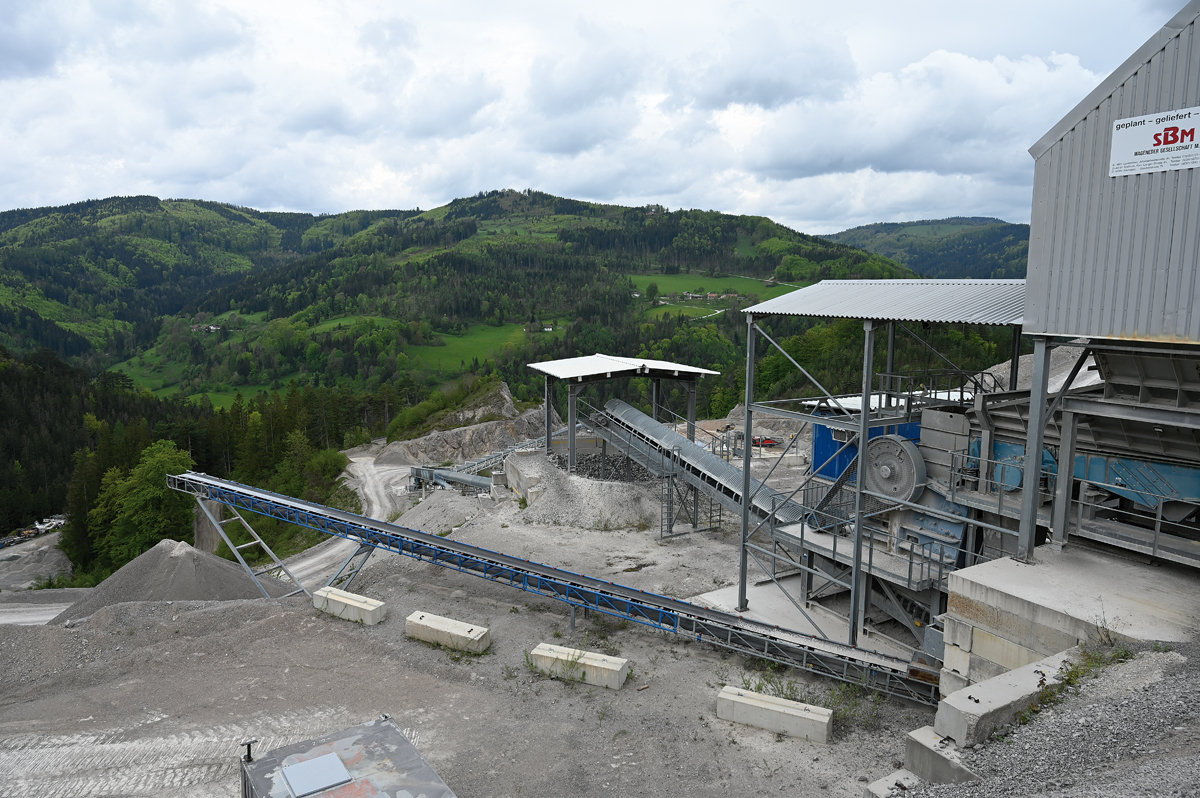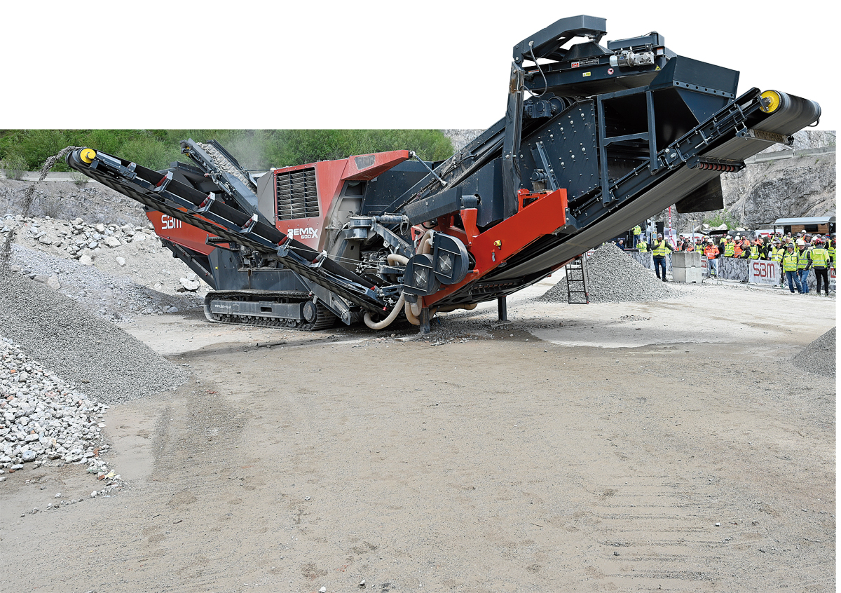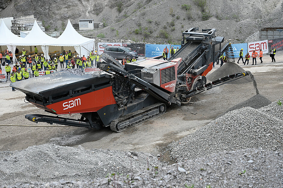 Neben einem nunmehr hellwachen Publikum hatte die Sprengung auch zur Folge, dass die Remax 600 genügend »Futter« für die Live-Vorführung bekam. Abgebaut wird in dem von der Unternehmensgruppe Zöchling betriebenen Steinbruch vorwiegend Dolomit. Über eine ausgeklügelte Materialseilbahn, die sich über das weitläufige Abbaugebiet erstreckt, gelangt das herausgelöste Material zu den Weiterverarbeitungsanlagen. Und genau hier ist Zöchling bereits seit vielen Jahren treuer Verfechter von SBM-Brechern, weshalb auch die Unternehmensgruppe einen genauen Blick auf die neue Anlage geworfen hat. »Wir freuen uns, dieses Event im Steinbruch der Firma Zöchling veranstalten zu dürfen, einem Partner, den wir bereits seit vielen Jahren mit unseren Maschinen begleiten dürfen und der uns heute eine tolle Plattform für die Präsentation unseres neuen Brechers bietet«, so SBM-Geschäftsführer Erwin Schneller.