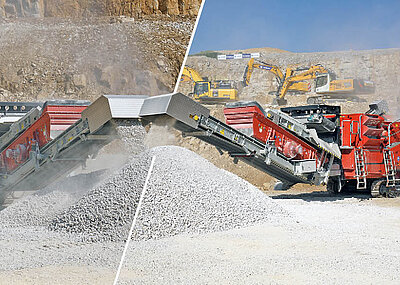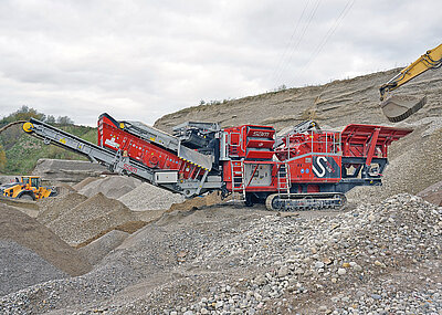 Das gewaschene Zwischenkorn 8/50 durchläuft die beiden hintereinander aufgereihten SBM- Produktionssiebmaschinen »KQ 15/740/2,5« (2,5-Deck) und den Eindecker »KQ 15/40/1«, die alle restlichen Endkörnungen 8/16, 16/22, 22/32 sowie 32/45 herstellen. Anfallende Überschusskörnungen oder Nachbrech-Chargen zur kurzfristigen Bedarfsdeckung kleinerer Fraktionen können über ein Rückführband zum Tertiärbrecher »SMR 10/5/4« (0/50; bis 80 t/h) geleitet werden. Auch die kleinere SBM-»Sandmühle« produziert hochwertige Sande und Splitte, gewährleistet niedrige Betriebskosten und ist damit eine echte Alternative zu zweistufigen Nachbrechkombinationen aus Kegel- bzw. Kreiselbrechern mit nachgeschalteten Vertikal-Prallbrechern. Bei einer Produktionsleistung der Anlage von rund 280 t/h werden alle Endprodukte über weit auskragende Haldenbänder auf Lieferhalden mit einem Gesamtvolumen von rund 10 000 t in unmittelbarer Nähe zur Anlage gelagert und dort auf eigene oder Kundenfahrzeuge verladen.