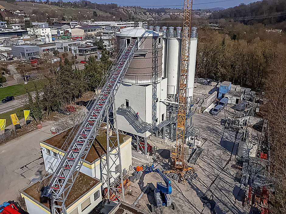 Für die Rohstoffversorgung der Towermix sorgt ein Gesteinslager mit acht Kammern und zusammen 450 m³ Puffer. Dank steilwandiger Auslaufkonen sollen auch schwerfließende Zugschlagstoffe restlos entleert werden. Das dazugehörige Bindemittellager besteht aus vier Silos mit je 2 x 60 t, wovon zwei Bindemittel in einer eigenen Waage für die Fließestrichproduktion dosiert und verwogen werden. Über eine separate Dosier- und Wiegeeinheit können bis zu sechs Zusatzmittel dem Mischer direkt zugegeben werden.