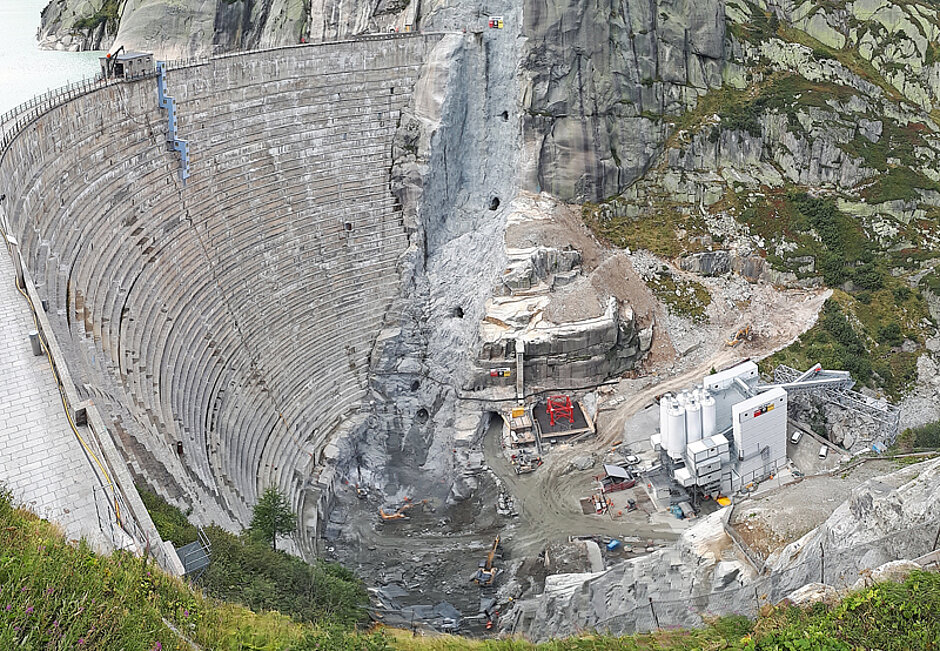 Um 1930 war mit der Staumauer Spitallamm im Berner Oberland eine der ersten und größten Bogengewichtsmauern erbaut und damit Pionierarbeit geleistet worden. Handlungsbedarf entstand nun durch einen Riss, der sich seit geraumer Zeit durch das Innere der Mauer zieht. Anstatt das Bauwerk abzubrechen oder zu sanieren, entschieden sich die Verantwortlichen, unmittelbar davor eine neue, doppelt gekrümmte Bogenmauer hochzuziehen – Kostenpunkt: 125 Mio. Franken. Ein Vorteil dabei ist, dass der Kraftwerkbetreiber KWO die Wasserkraft des Grimselsees auch während der sechsjährigen Bauzeit für die umweltfreundliche Stromerzeugung nutzen kann. Den Beton für die Ersatzmauer liefern Hochleistungsanlagen von SBM. Unterhalb der alten Staumauer wurden zwei Anlagen des Typs Linemix 3500 CM 800-6 H installiert, um in den kurzen, aber intensiven Bausaisonen Produktionsspitzen von gut 900 m³ Festbeton pro Tag und Ausfallsicherheit zu gewährleisten.