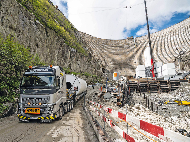 Auf fast 2 000 m Höhe stellt die Logistik eine gewaltige Herausforderung dar: Der Transport über Gebirgsstraßen, Stollen und Materialseilbahnen, die beengten Platzverhältnisse, Windgeschwindigkeiten von mehr als 200 km/h, Staublawinen, hohe Schneelast und extreme Temperaturen erschweren die Arbeitsbedingungen. Die Bausaison verkürzt sich aufgrund der schneereichen Winter auf Mai bis Oktober, dann sind mehr als 70 Spezialisten der »ARGE Grimsel« Tag für Tag im Einsatz.