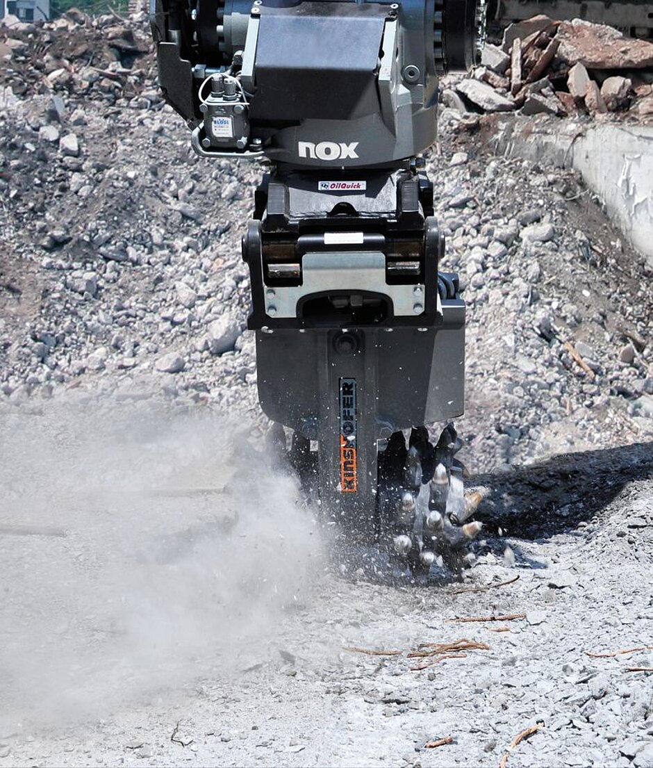 Die WS-Anbaufräsen. Die Fräsen sind mit Hochdrehmomentmotoren ausgestattet. Sie erzeugen in Kombination mit einem Untersetzungsgetriebe eine sehr hohe Schneidkraft. Zusammen mit der optimalen Auswahl der richtigen Frästrommeln und der passenden Meißel garantiert diese Kombination das optimale Eindringen in das Gestein und damit eine sehr hohe Produktivität. Der Betrieb einer Anbaufräse bietet sich insbesondere dort an, wo ein Hydraulikhammer ineffizient oder nicht erlaubt ist. Das betrifft vor allem Gebiete, in deren Umfeld besonders vibrationsarm gearbeitet werden muss oder Einschränkungen in Form von Lärmschutzbestimmungen vorliegen. Unterwassereinsätze mit der KINSHOFER-Anbaufräse sind dank einfacher Modifikationen an der Fräse bis max. 25 m Tiefe kein Problem.