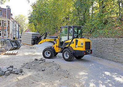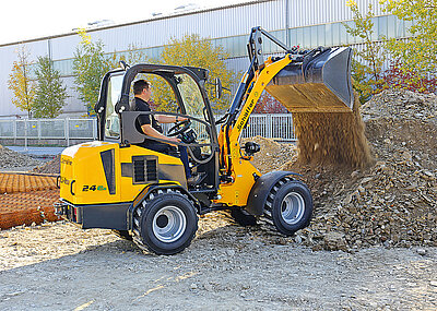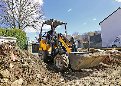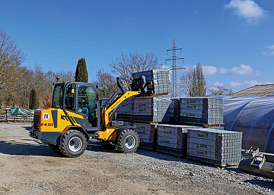 Die Elektrolader wurden jeweils mit einer Erdschaufel und einer Palettengabel ausgeliefert. Sie werden – je nach Einsatzort – die unterschiedlichsten Lade- und Transportarbeiten übernehmen. Die Kapazität der Lithium-Ionen-Batterie beträgt 6,7 kWh. Durch Hinzufügen eines zweiten Batteriepaketes besteht aber auch im Nachhinein noch die Möglichkeit, die Leistung der Batterie auf 13,4 kWh zu verdoppeln, um die Einsatzzeit auf fünf Stunden und mehr zu verlängern. Serienmäßig sind die Maschinen mit einem internen Ladegerät ausgestattet, mit dem die Maschine mit herkömmlichem 230 V Haushaltsstrom geladen werden können.