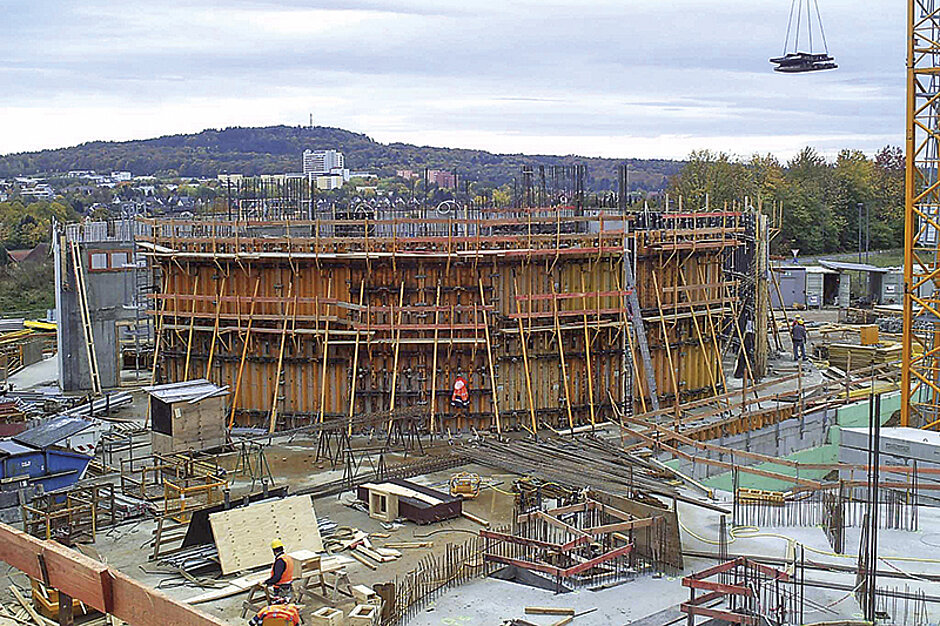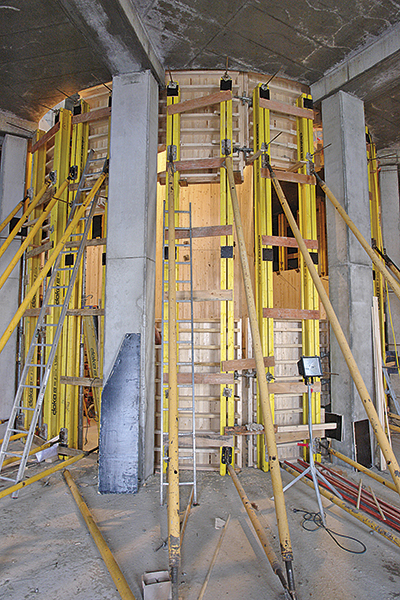 Auch mit der Planung und Lieferung von Sonderschalungen für die Betonage von aufwendig geformten Bauteilen konnten die ULMA-Techniker ihre Flexibilität und ihr Schalungs-Know-how unter Beweis stellen. »Neben den Brückenkonstruktionen aus Ortbeton, die die Türme miteinander verbinden, zählt insbesondere der auf Konsolen gelagerte großzügige Treppenaufgang in Turm 3 zu den schalungstechnischen Leckerbissen der Baumaßnahme«, erläutert Dipl.-Ing. (FH) Michael Bölitz (ULMA). »Für seine Erstellung waren Sonderanfertigungen erforderlich, um die Vorgaben in Bezug auf die Formgebung, aber auch in Bezug auf die Oberflächenstruktur umzusetzen«, so Bölitz. Die für die Betonage der Treppe nötigen Schalelemente wurden durch ULMA vorgefertigt und zur Baustelle transportiert, wo die Zimmerleute die Teile in dem runden Baukörper montiert haben.