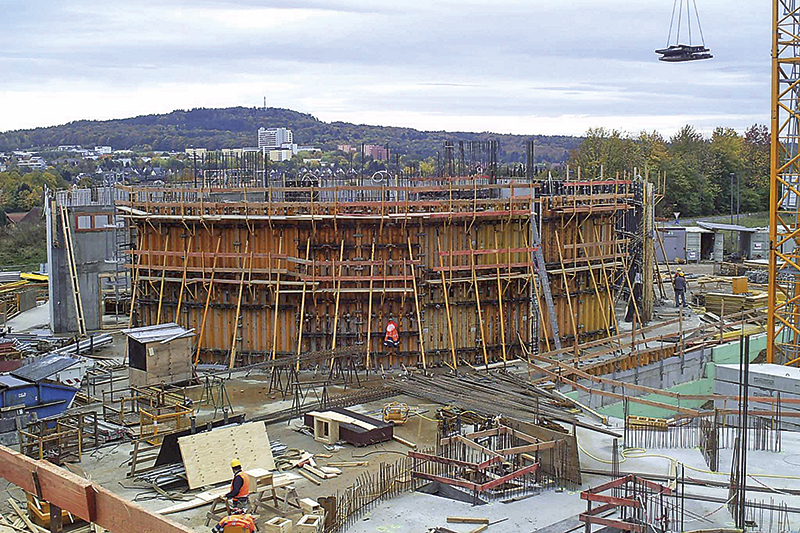 Die Realisierung des architektonischen Grundkonzepts war nach Aussage des Oberbauleiters fester Bestandteil in den wöchentlich stattfindenden Baubesprechungen, an denen auch ULMA-Projektingenieur Dipl.-Ing. (FH) Werner Olschewski regelmäßig teilnahm. Hier haben die Baupartner unter anderem die einzelnen Bauteile besprochen und im Vorfeld schalungstechnische Lösungen für besonders knifflige Bauwerksteile optimiert. Im Wesentlichen lieferte ULMA Bira-Rundschalung, Orma-Rahmenschalung und die Stützenschalung F4 auf die Baustelle, zeitweise in enormen Mengen. »In der Hochphase haben wir Schalungsmaterial im Wert von rund 5,5 Mio. Euro vorgehalten«, erinnert sich Bauleiter Dipl.-Ing. (FH) Steffen Fleischer (Adolf Lupp). Das hat der Schalungshersteller logistisch termingerecht und zur Zufriedenheit der am Baubeteiligten Firmen umgesetzt – hierin sind sich Bauleiter Fleischer und Oberbauleiter Pracht einig. »Es hat logistisch funktioniert, wirtschaftlich gepasst, und es war für die technischen Anforderungen der Baustelle die optimale Lösung«, so das vorläufige Fazit von Pracht.Anspruchsvolle Statik