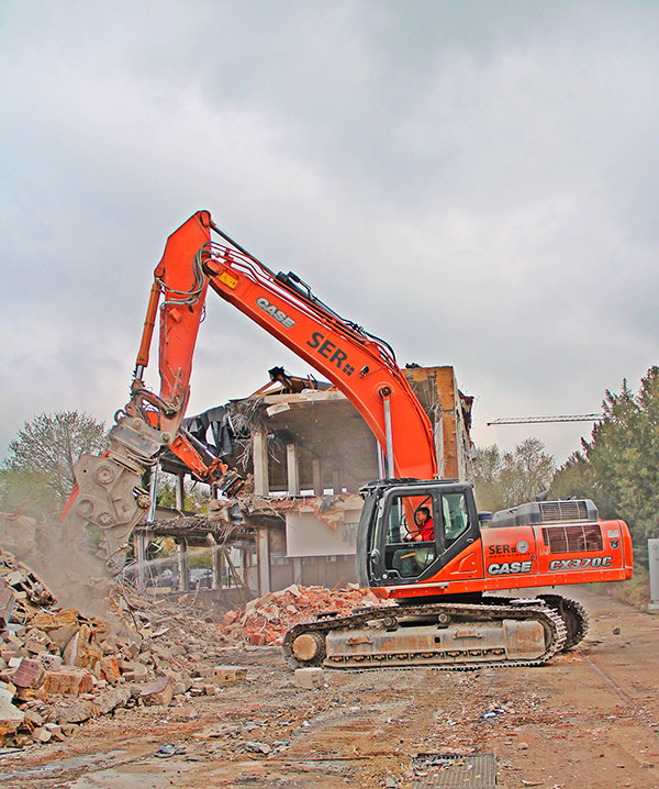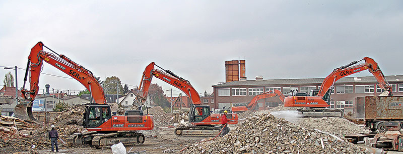 Im Juni letzten Jahres hatte die Bouwfonds Immobilienentwicklung das Gelände an der Sigmaringerstraße von den Hansa Metallwerken erworben, um das zentral gelegene Industriegelände in ein urbanes Mischgebiet für Gewerbe und Wohnungsbau umzuwandeln. Hier sollen die neue Hauptverwaltung der Hansa, eine Feuerwache sowie verschiedene Gewerbe- und Wohneinheiten entstehen. Mit den Abbruch- und Erdarbeiten wurde der Rückbau- und Sanierungspezialist SER aus Heilbronn betraut. Der Auftrag gliedert sich in zwei Bauabschnitte. Dabei mussten insgesamt 20 Gebäude mit einem umbauten Raum von rund 200 000 m³ abgebrochen werden. Um den engen Zeitplan einzuhalten, entschied sich SER für den 48-t-schweren Case-Raupenbagger CX470B mit einer Motorleistung von 362 PS und setzt zudem drei 37-Tonner vom Typ CX370C mit jeweils 266 PS Leistung ein.Reiner Kuch, Leiter der Case-Werksniederlassung Stuttgart, berichtet: »Die neue C-Serie der Raupenbagger haben wir erst im letzten Jahr auf der Intermat in Paris vorgestellt. Daher sind wir besonders stolz darauf, dass wir den Branchenführer SER so schnell für die neue Serie begeistern konnten. Der Auftrag von SER umfasste gleich sieben Raupenbagger vom Typ CX370C.« Laut SER hat vor allem die hohe Leistung und Wirtschaftlichkeit der Maschinen, aber auch die robuste Konstruktion und Zuverlässigkeit den Ausschlag zum Kauf gegeben. Mit der neuen C-Serie hat Case zudem eine neue Generation sparsamer Raupenbagger im Programm, die bei höherer Motorleistung deutlich weniger Kraftstoff verbrauchen.