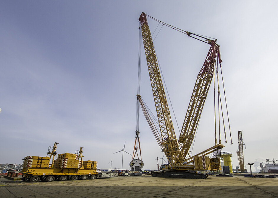 Seit Anfang 2017 ist Schmidbauer an diesem Terminal für den Geschäftspartner Buss Offshore Solutions aktiv, voraussichtlich wird der Einsatz noch bis Oktober 2018 dauern. Die Schwerlastexperten aus München sorgen am Terminal für das Handling der WEA (Windenergieanlage)-Komponenten: Ein 48 Achsen SPMT G4 und 2 x 8,40 m Spacer transportieren die gigantischen Turmsegmente zur Vormontage ins Zwischenlager, wo sie mit Hilfe der Raupenkrane LR 11350 und LR 1600/2 auf Fundamenten vertikal vormontiert werden. Anschließend werden sie direkt vom Errichterschiff übernommen.