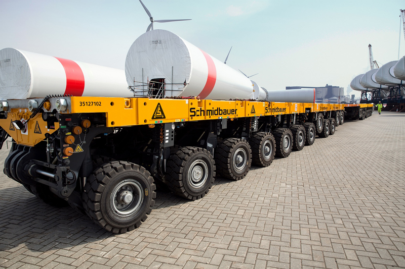 Aktuell ist Schmidbauer mit den SPMTs u.a. im Einsatz am Orange Blue Terminal im niederländischen Eemshaven. Von diesem Feederport aus werden die Komponenten für den Bau des Offshore Windparks Merkur in die Nordsee verschifft. Ungefähr 45 km nördlich der Insel Borkum entstehen hier derzeit 66 Windenergieanlagen des GE-Typs „Haliade 150“, deren Regelarbeitsvermögen ca. 1750 GWh pro Jahr erreichen soll.