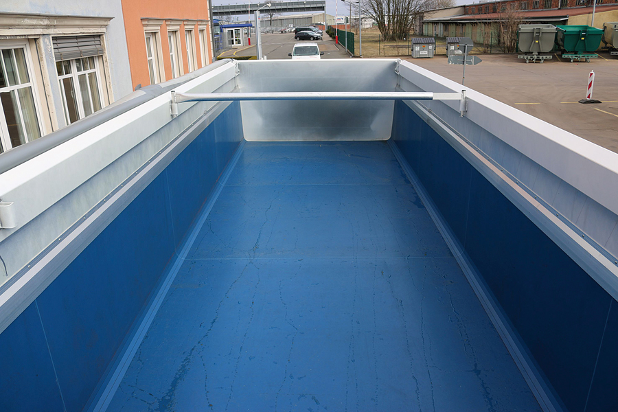 Die Kunststoffauskleidung ist in den beiden seitlichen Höhen 300 mm sowie 900 mm lieferbar und will mit einer blauen Oberfläche ein deutliches Erkennungsmerkmal bieten. Zur Auskleidung der Mulde werden 12,5 mm (S.KI 7.2 und 8.2) bzw. 10 mm (S.KI 9.6 und 10.5) starke Kunststoffplatten in der Mulde schwimmend verlegt, verschweißt und im vorderen Bereich an Boden und Stirnwand verschraubt. An der Seiten- und Stirnwand wird die Auskleidung mit Aluprofilen arretiert und gegen herabfallendes Schüttgut abgedichtet. Die Kunststoffauskleidung ist für den deutschen Markt beim Bundesamt für Güterverkehr »De-minimis«-förderfähig.