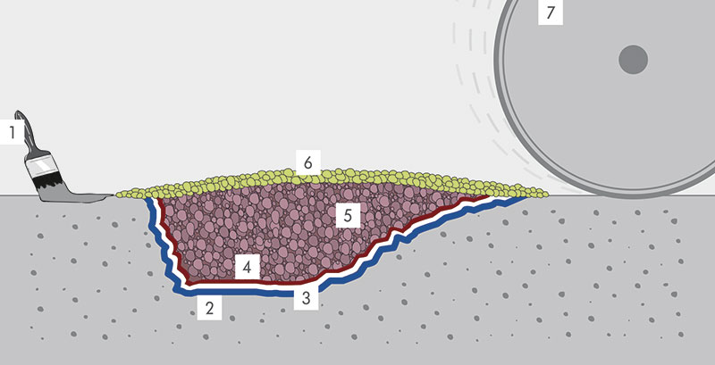 - mit bitumenhaltiger Mischung aufgefüllt (bei tiefen Stellen mit 4–6 mm oder 2–10 mm)