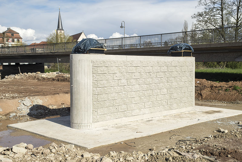 Die neue Brücke wird 4 m nördlich der bestehenden errichtet. Das neue Objekt wird als zweistegiger Spannbetonplattenbalken gebaut und besitzt sieben Felder. Das Bauunternehmen erstellte die Gründung mithilfe von Bohrpfählen, die einen Durchmesser von 1,5 m haben. Damit die neue Brücke nicht nur verkehrstechnisch eine Verbesserung, sondern auch optisch ansprechend ist, entschieden sich die Verantwortlichen dafür, ihre Pfeiler ab einer Höhe von 2,13 m mithilfe von Strukturmatrizen zu gestalten. Damit wurde kostengünstig der Wunsch des Gemeinderates nach einer Natursteinverblendung erfüllt. Gewählt wurde das NOE-Schaltechnik-Motiv »Kufstein« das der Natursteinverblendung der alten Brücke sehr nahe kam. Es bildet die Oberflächenbeschaffenheit von steinmetzmäßig bearbeiteten Natursteinquadern ab. Der Aufbau der Strukturmatrize ist so gewählt, dass sie in Länge wie Höhe beliebig ergänzt werden kann. Spätestens wenn das Bauwerk etwas »Patina« angesetzt hat, wird es nur noch für den Fachmann ersichtlich sein, dass es sich bei der »Natursteinverblendung« um eine strukturierte Betonoberfläche und nicht um eine echte Natursteinverblendung handelt. Die Strukturmatrize kann in Länge wie Höhe beliebig ergänzt werden.