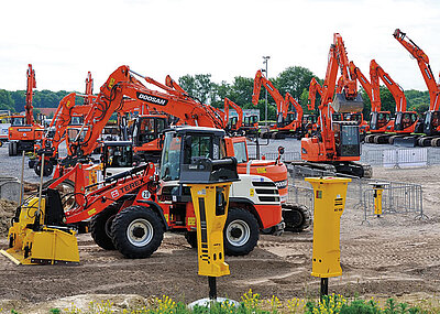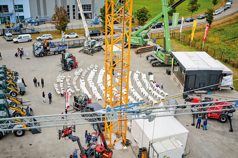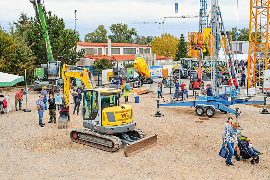 Zwei Oben- und zehn Untendreherkrane von Potain und MiDi Cranes, acht Mobil- und Raupenkrane von Sennebogen, 28 Bagger und Radlader von Kramer Allrad und Wacker Neuson, zwölf Teleskopen sowie Stapler von Manitou, Elektro- und Benzinverdichter von Wacker Neuson, Maurertechnik von Lissmac und Kleinmaschinen, Geräte sowie Werkzeuge von weiteren Herstellern verwandelten einen Teil des Firmengeländes für zwei Tage in eine Messelandschaft. Komplettiert wurde das Bild durch Infostände beispielsweise der Messe Karlsruhe und der Bühne des Kammertheaters Karlsruhe.