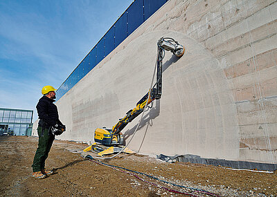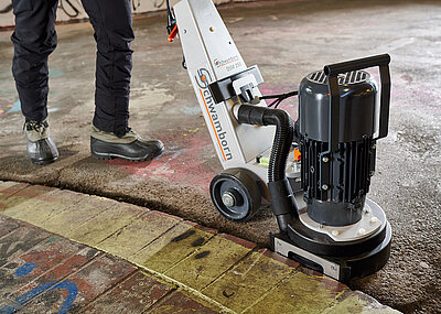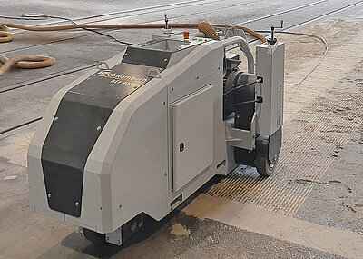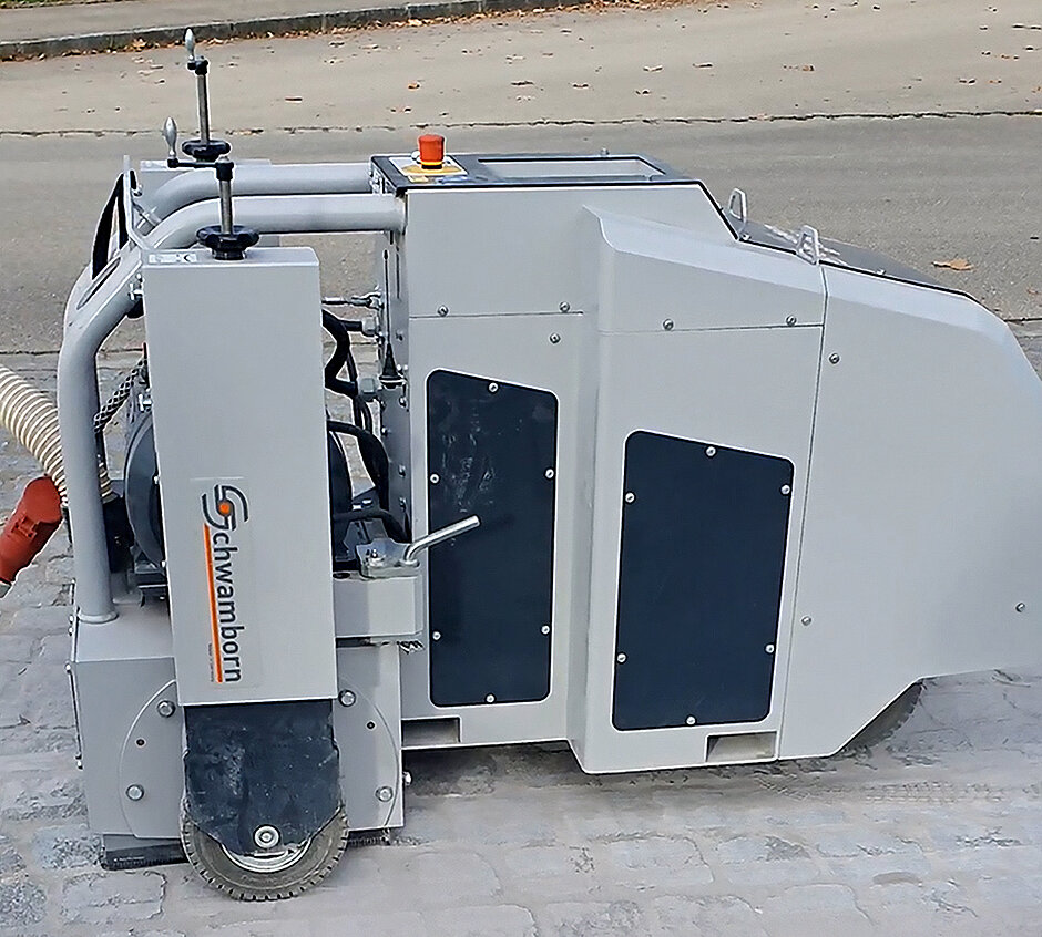 Grundlage für ein solches Verfahren ist laut Schwamborn zunächst einmal eine Innovation in der Fräsmaschinen-Herstellung. Denn mit der Fräsmaschine BEF 400RC von Schwamborn gibt es eine Maschine, die laut Hersteller mit effektiver Flächenleistung in der Lage ist, unebene Naturstein-Oberflächen einzuebnen. Bisher gab es schlichtweg keine Maschine, die mit einer so hohen elektrischen Motorleistung und einem notwendigerweise hohen Arbeitsgewicht für das Abfräsen bzw. Schneiden großer Flächen von unebenen harten Bodenbelägen wie Natursteinpflaster geeignet gewesen wäre. Bei einer Arbeitsbreite von 400 mm kann die per Fernsteuerung und damit ergonomisch bedienbare Maschine sowohl mit klassischen Fräsrotoren als auch mit Trennscheiben, die den Boden einebnen, bestückt werden.