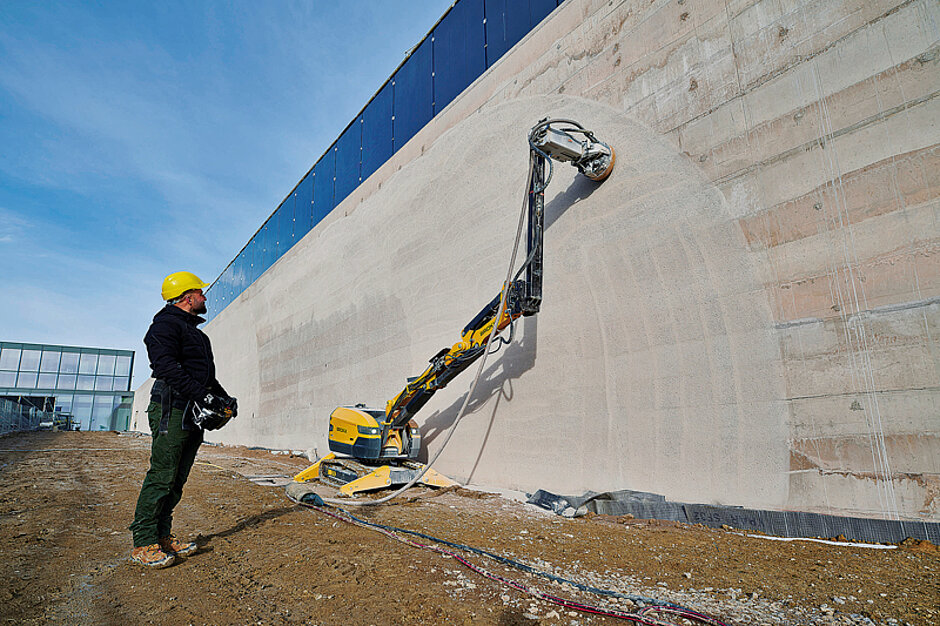 Der Beton wurde in zwei farblich abgesetzten Schichten in die Schalung eingebracht und nach dem Erhärten ausgeschalt. Für die finale Optik wurden die Wände gestockt, ihre Oberfläche also in einer an Steinmetze erinnernden Art bearbeitet. »Mit unserer neuen Schleifmaschine und den für sie konzipierten Stockrollen konnten wir in nur einer Woche die große Wand im ›Würth Forum‹ stocken«, erläutert Siegmund Griesheimer, Leiter der Schwamborn Anwendungstechnik. »Normal wäre über Wochen per Handarbeit und aufwendigem Gerüstbau gearbeitet worden, um ein nicht so gleichmäßiges, ähnliches Ergebnis zu erzielen.«
