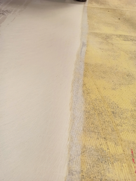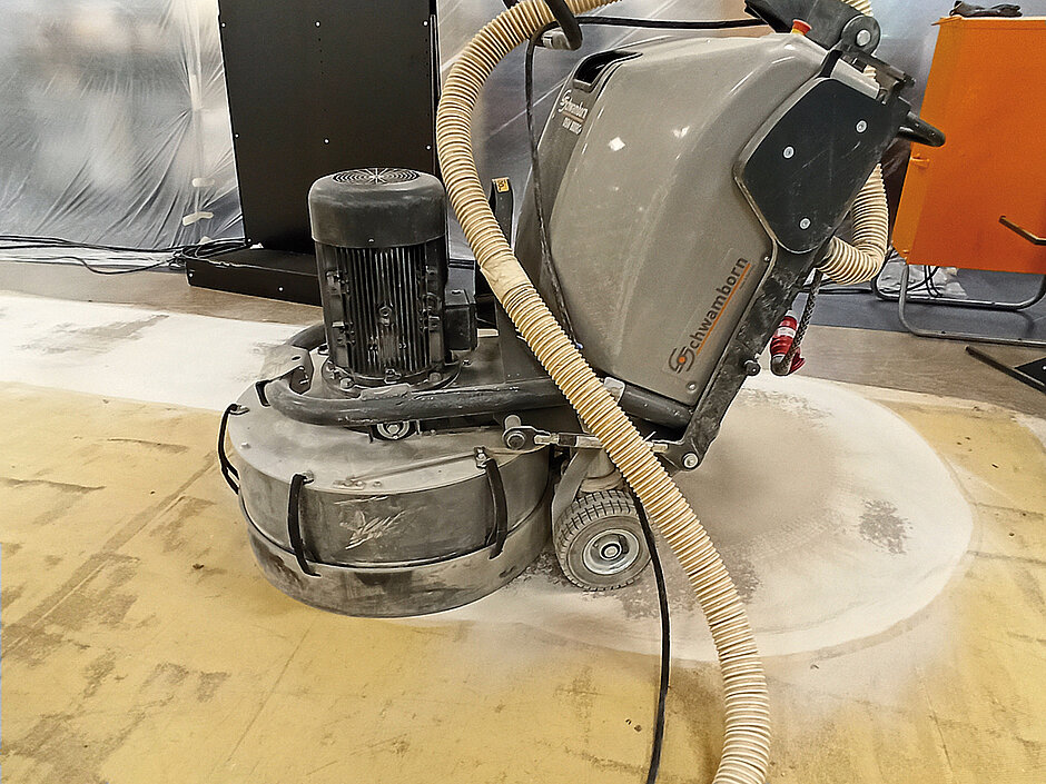 Zunächst wurde der aus PVC, Linoleum und Teppichboden bestehende Bodenbelag mit einem Aufsitz-Fußbodenstripper abgetragen. Danach musste zum einen die noch vorhandene Spachtelmasse und die Epoxidharzbeschichtung entfernt und zum anderen der Boden für den neuen Belag vorbereitet werden. Mit der Schwamborn DSM 800RC, einer mit Fernsteuerung bedienbaren Drei-Scheiben-Schleifmaschine, konnte diese Arbeit mit größtmöglichem Komfort für den Bediener durchgeführt werden, so Schwamborn. Gemäß dem Leitsatz von Schwamborn »Harte Böden, weiche Bindung – weiche Böden, harte Bindung« wurde die DSM 800RC mit den neuen Schwamborn Giants C-SSC mit einer 20er-Körnung ausgestattet. Diese Schleifdiamanten der »Triple A-Klasse« sollen durch ihre Haltbarkeit und Gründlichkeit auf großen Flächen überzeugen.