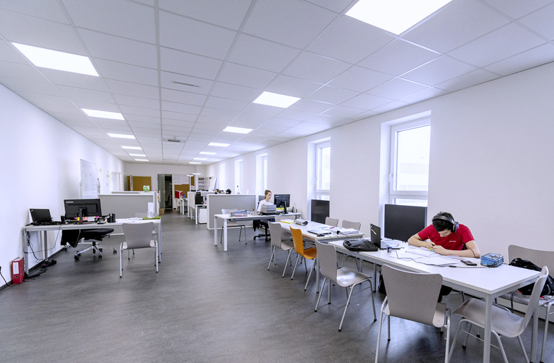 Schließlich wurde ein Open Space eingerichtet, der zur Begegnung von allen mit allen gedacht ist. Auf einer offenen Kunstrasenfläche samt großzügigem Balkon und freiem Blick auf die Fahrzeugmontage finden sich Sportmöglichkeiten wie Tischtennis oder Tischfußball ebenso wie Begegnungsecken. Hier soll der Austausch zwischen allen Gruppen der Organisation stattfinden, zwischen Management und Beschäftigten, zwischen Produktion und Verwaltung oder zwischen Lehrlingen und erfahrenen Fachkräften. „Alle Beschäftigten haben hier einen Ort, wie er uns bisher gefehlt hat. Man kann sich treffen, aktuelle Themen diskutieren, sich zurückziehen oder auch gemeinsam eine Projektidee vorantreiben. Letztendlich wird es zu Begegnungen kommen, die sonst nicht stattgefunden hätten“, ist CEO Hartwig überzeugt.