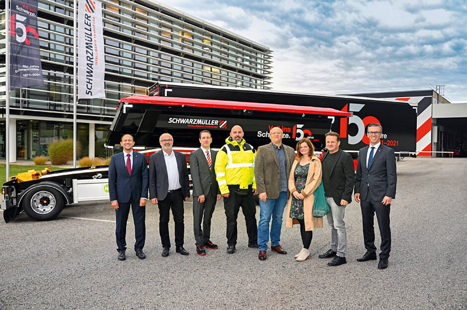 Mit der Preisübergabe an die drei Gewinner eines Neufahrzeugs fand Ende Oktober einer der Höhepunkte des Schwarzmüller-Jubiläumsjahres 2021 statt (das bauMAGAZIN berichtete in Heft 11/21, Seite 16). Unter mehr als 4 000 Gewinnspielteilnehmern wurden drei Unternehmen aus Deutschland, Polen und Tschechien gezogen, die die Fahrzeuge im Gesamtwert von mehr als 100 000 Euro am österreichischen Schwarzmüller-Sitz Hanzing entgegennahmen. Der 3. Preis war ein Behältertransportanhänger des deutschen Tochterunternehmens Hüffermann und ging an Sommer Transport im tschechischen Tachov. Das polnische Transportunternehmen Kama Jarosław Krasowski aus Tomaszów Mazowiecki gewann als 2. Preis ein Fernverkehrsfahrzeug der neuen »Power Line«. Den 1. Preis, einen Kippsattelanhänger, holte sich das deutsche Unternehmen Reinhold und Marcel König aus dem hessischen Viernheim. t