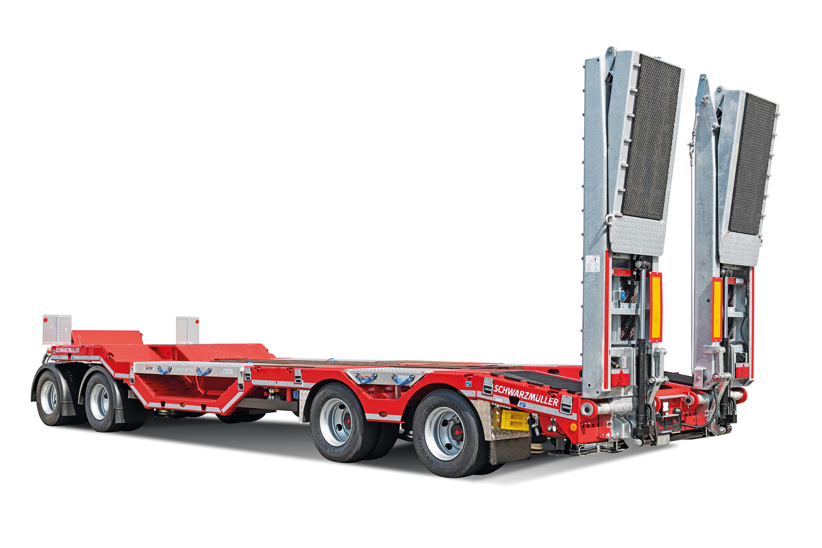 Wichtigste Kriterien eines Tiefladers für den Transport von Baumaschinen sind eine robuste Rahmenkonstruktion sowie eine niedrige Ladehöhe. Exakt das will der Vier-Achs-Tiefladeanhänger mit Baggerstielmulde und Walzenvorbau bei einer Ladehöhe im Tiefbett von ca. 0,87 m bieten. Zwei Paar Radmulden reduzieren die Ladehöhe um bis zu 0,4 m. So können auch Radlader bis 3,53 m Höhe und ohne Ausnahmegenehmigung transportiert werden. Zahlreiche Zurrringe und Aufnahmetaschen im Außenrahmen dienen der Ladungssicherheit. Auch eine Baggerlöffelmulde im Fahrzeugheck sorgt für Sicherheit beim Ablegen des Baggerstiels. Gewählt werden kann zwischen 1- und 2-teiligen Rampen, um den Auffahrwinkel auf das Baufahrzeug abzustimmen. Hydraulisch betätigte Rampen erleichtern den Umgang beim Be- und Entladevorgang. Zuggabel, Drehgestell und Auffahrrampe sind serienmäßig feuerverzinkt. t