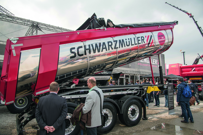 Im laufenden Jahr plant die Schwarzmüller-Gruppe die Produktion von 9 900 Fahrzeugen, davon 4 900 Einheiten im Bausegment (2018: 4 188 Fahrzeuge; + 17 %). Dabei rechnet Roland Hartwig nicht nur mit einem starken Impuls durch die Bauma, positive Effekte erwartet er sich auch vom neuen Standort im fränkischen Eltmann. Dorthin werden die in Tschechien und Österreich produzierten Fahrzeuge zur Abholung durch die deutschen Kunden überstellt. Dieser Standort bietet mittlerweile die gesamte Bandbreite der Schwarzmüller-Services von der Werkstätte bis zu Mietfahrzeugen. Michael Wulf ß