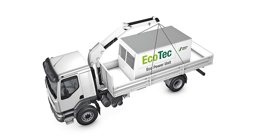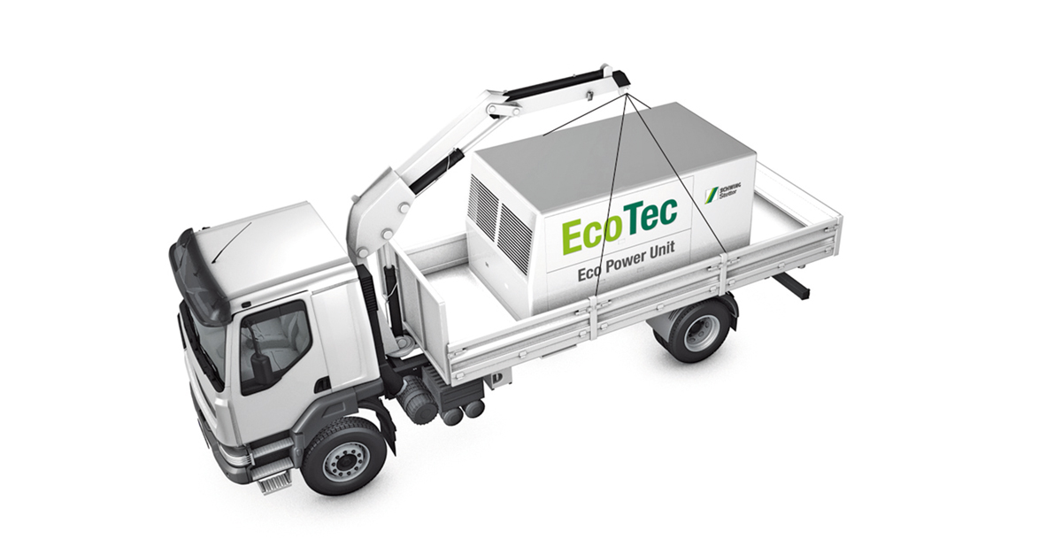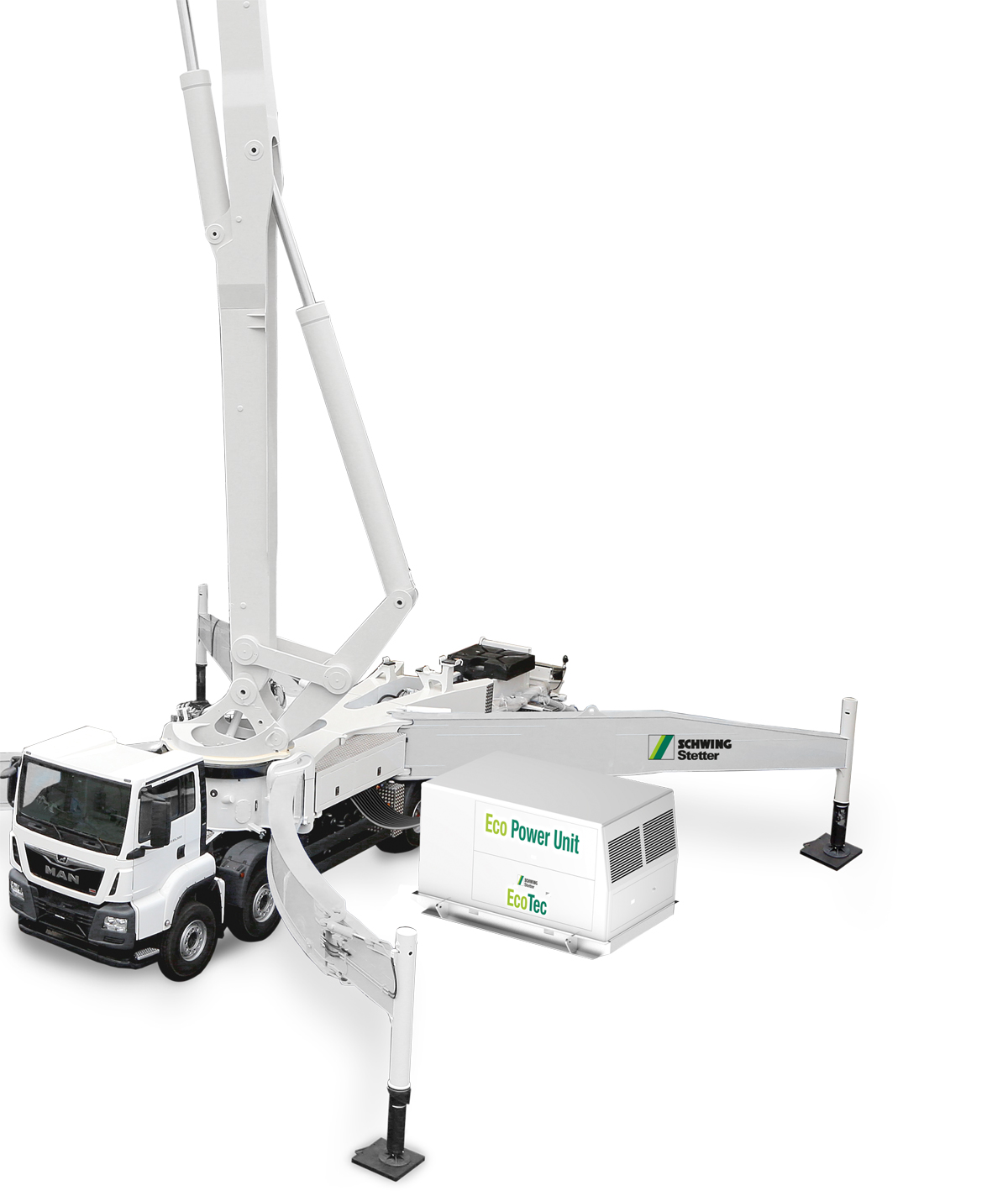 Schwing stellt mit dem Eco-Power-System eine hybride, flexible Lösung für Neu- und Bestandmaschinen vor. Mit der Kombination aus einem Upgrade für die Betonpumpe und einem externen Aggregat soll jede beliebige Schwing-Autobetonpumpe der vergangenen 15 Jahre in die Lage versetzt werden, sowohl elektrisch als auch konventionell mit dem vorhandenen Nebenantrieb zu operieren.