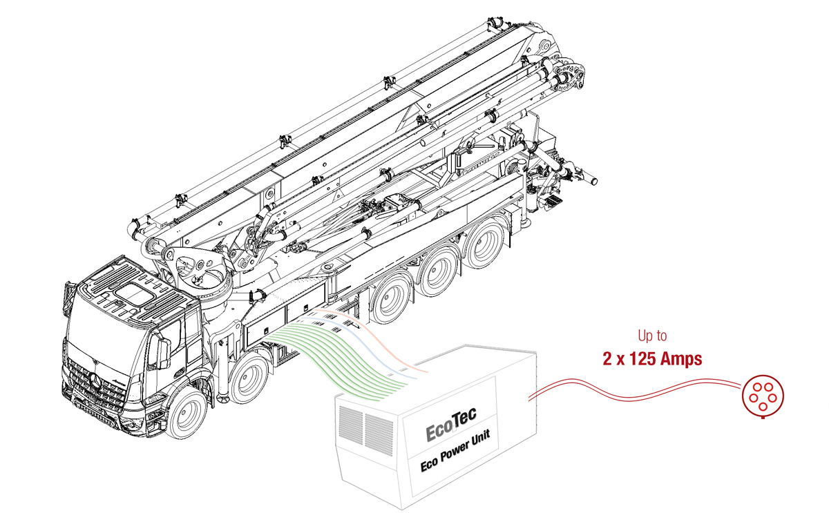 Mit der Kombination aus einem Upgrade für die Betonpumpe und einem externen Aggregat soll jede Schwing-Autobetonpumpe der vergangenen 15 Jahre in die Lage versetzt werden, sowohl elektrisch als auch konventionell mit dem vorhandenen Nebenantrieb zu operieren.