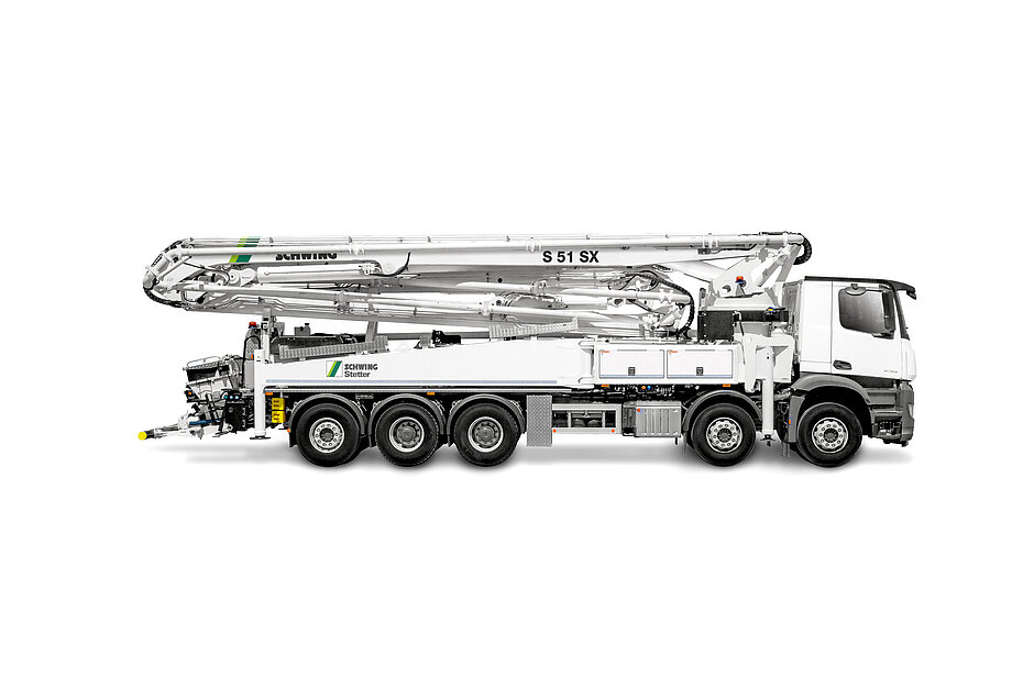 Die S 51 SX hingegen zeichnet sich durch ein deutlich reduziertes Gewicht bei gewohnter Stabilität und Langlebigkeit auszeichnet. Aufgebaut auf einem 10x4 EURO 6 Fahrzeug ergibt sich ein typisches Einsatzgewicht von unter 40 t mit ausreichender Reserve für Zusatzausstattungen und Zuladungen.