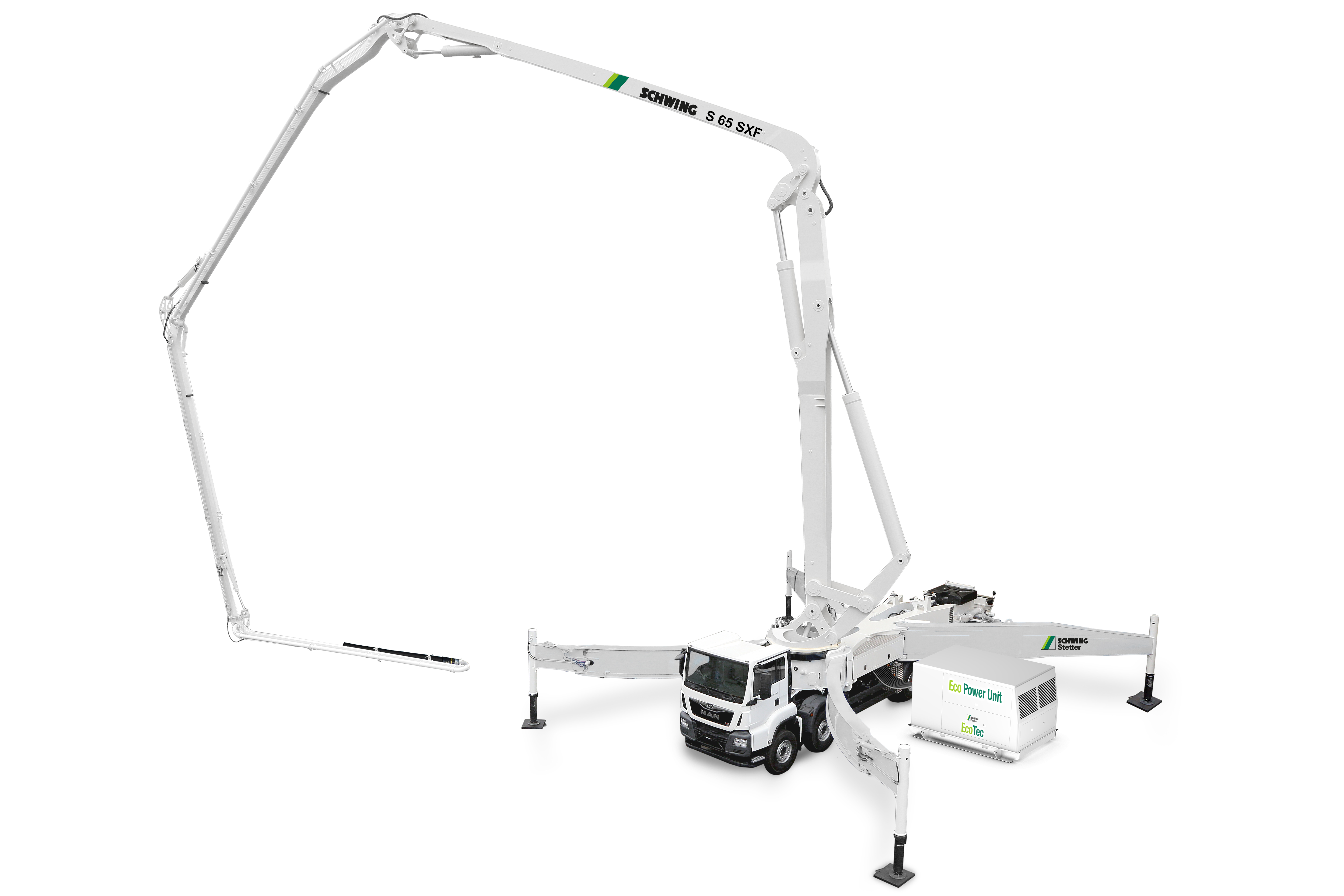 Mit dem Eco Power System, der hybriden Nachrüstlösung mit externem Zusatzaggregat, stellt SCHWING erstmals die Möglichkeit vor, konventionell mit Verbrennungsmotor ausgestattete Autobetonpumpen elektrisch aufzurüsten.