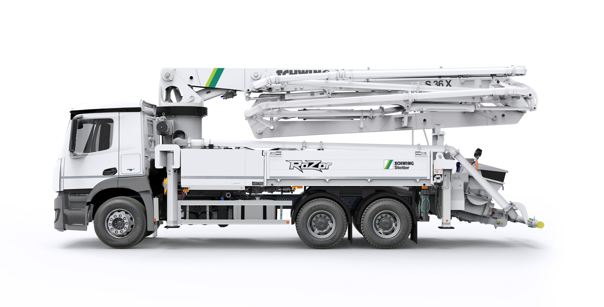 Mit der S 36 SX RaZor und ihrem fünfteiligen Mast mit der flexiblen RZ-Faltung überzeugt die neue Autobetonpumpe durch ihre besonders geringe Ausfalthöhe von unter 6,77 m. Auch profitiert die Maschine von ihrem geringen Platzbedarf durch die hintere H-Abstützung und weist, dank einem Radstand von nur 4,20 m eine hohe Wendigkeit auf. Durch konsequent modernen Leichtbau bleibt auch die S 36 XZ unverändert ein Leichtgewicht. Mit einer DN125er-Leitung, bewährten Standardrohrbögen und einem geteilten 3,5 m Endschlauch ist sie die ideale und energiesparende Lösung auch auf engem Raum.