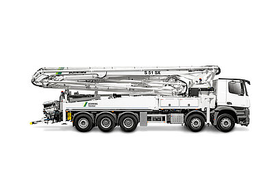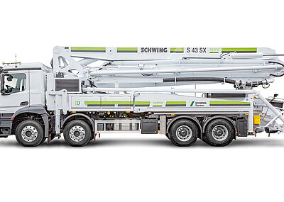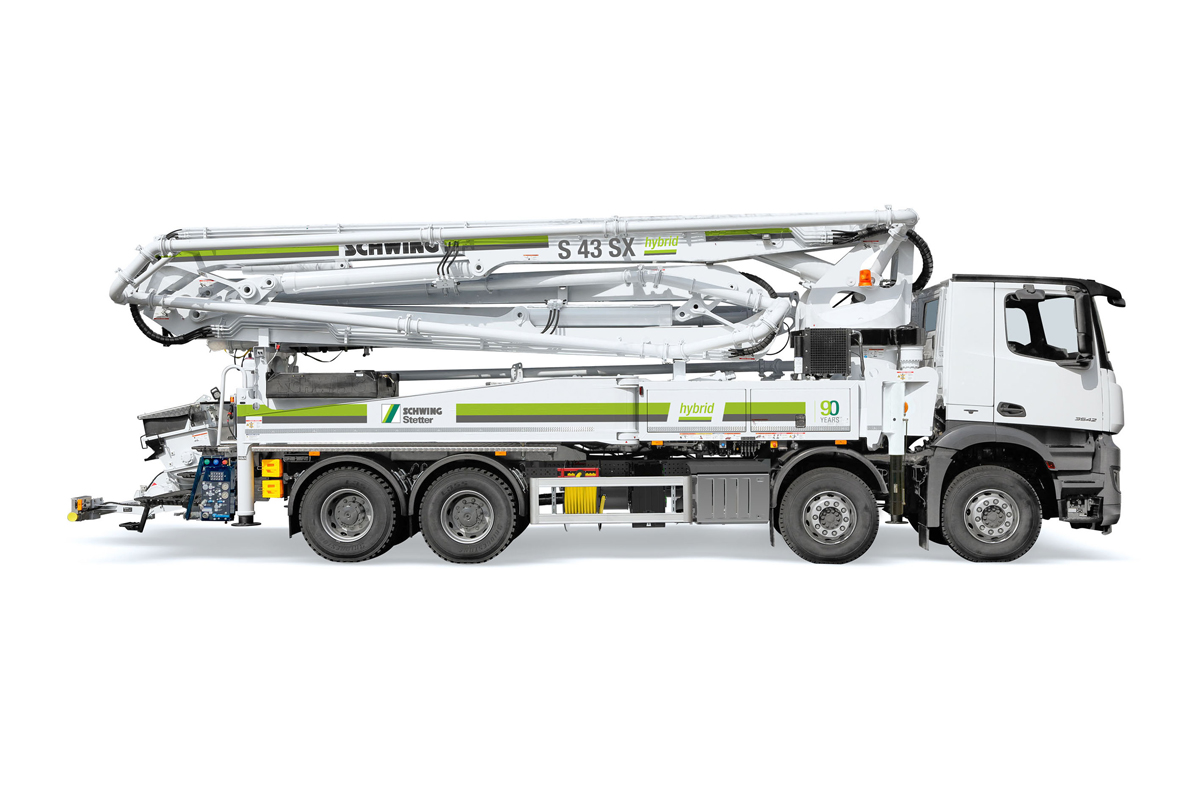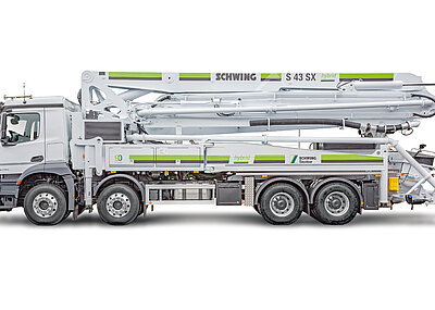 Hybride Antriebstechnologien bieten eine Reihe grundsätzlicher Vorteile: Flexibilität, Vielseitigkeit, reduzierter Schadstoffausstoß sowie geringere Betriebskosten bei verbesserter Leistung. Die S 43 SX hybrid erreicht das Prinzip einer elektrisch betriebenen Pumplösung durch die Auflösung des Pumpenstrangs sowie über ein neugedachtes Prinzip des Fahrzeugaufbaus. Die einzelnen Pumpenleistungen werden über die Drehzahl des dazugehörigen Elektromotors (83 kW im Elektrobetrieb, 40 kW im Generatorbetrieb) optimal auf den aktuellen Betriebspunkt, die Hubzahl oder die Betonfördermenge abgestimmt. Im elektrischen Betrieb wird die nicht benötigte große Antriebspumpe ausgekuppelt. Das Schwing-Hybrid-Konzept erziele weiter die höchste Pumpleistung. Doch selbst im Dieselbetrieb steige allein durch den aufgelösten Pumpenstrang, über ein völlig neues Leistungsmanagement und anhand der optimierten Drehzahlregelung, die Effizienz. Dies soll für eine optimale Ausnutzung der vorhandenen elektrischen Anschlussleistung sorgen.