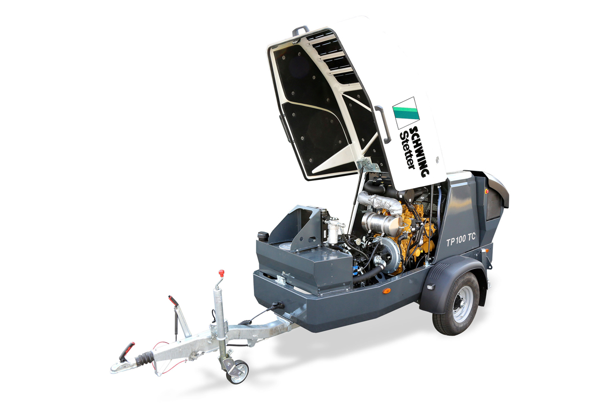 Die kompakte Anhängerpumpe TP 100 ist das mobile Kraftpaket für Baustellen, auf denen Estrich, Mörtel, Feinbeton oder Beton mit einer Korngröße von bis zu 32 mm wirtschaftlich und zuverlässig gefördert werden. Auf der diesjährigen NordBau präsentiert Schwing mit der TP 100 TC eine neue Variante des Erfolgsmodells. Bei der TP 100 TC (Twin Circuit) ermöglicht eine Zweikreishydraulik ein schnelles Umschalten des ROCK-Schiebers und damit nur noch kleine Druckstöße/ Pumpschläge. Pumppausen werden reduziert und der für Spritzbeton wichtige kontinuierliche Fluss ermöglicht, etwa im Tunnelbau. Neben mehr Bodenfreiheit und einem neuen 45 kW-Motor bietet Schwing jetzt auch die ShotCrete-Option SCM80 an: Das Spritzbeton-System, bei dem die Pumpe für das Additiv des Erstarrungsbeschleuniger vollständig mit dem Rock-Ventil synchronisiert ist und eine besonders homogene Spritzbeton-Mischung garantieren soll. Klassisch verbaut sind baureihentypische Leistungskomponenten wie die Pumpenbatterie P0615 und der speziell für die TP-Serie entwickelte XS-Rock-Schieber. Für die TP 100 stehen drei Diesel- und zwei Elektromotoren sowie das optionale EcoClean-Verfahren zur Auswahl.
