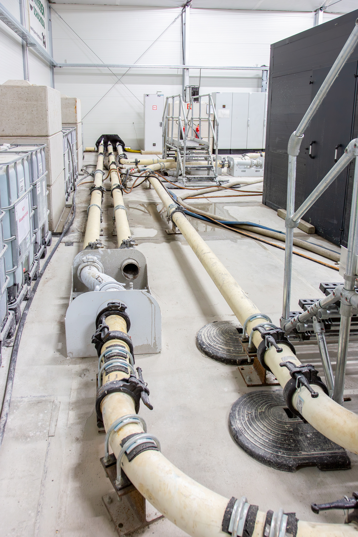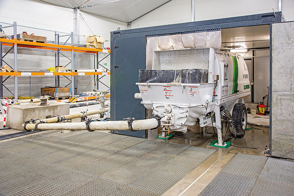 Insbesondere für die Verfüllung von Schacht XII ergaben sich besondere Anforderungen. So sollte die übertägige Betonförderung von der Pumpstation bis zur Übergabestation am Schacht mit einer stationären Betonpumpe über eine 150 m lange Förderleitung erfolgen. In der Pumpstation wurde eine SP 2800 E, eine stationäre Betonpumpe mit 132 kW elektrischer Antriebsleistung und einem maximalen Betonförderdruck von 108 bar, installiert. Auch für die Verfüllung von Schacht II wurde eine SP 2800 E installiert. Aus Lärmschutzgründen für den Museumsbetrieb bekamen die Stationärpumpen Schalleinhausungen. Das Förderleitungskonzept beinhaltet, dass bei eventuellen Komplikationen in jedem Fall eine Redundanz gegeben ist und auch die Reinigung oder Betonage-Abbruchkonzepte im Hinblick auf die Rückförderung des Betons zur Pumpstation wirtschaftlich ermöglicht werden. Zudem darf für den Fall einer defekten oder beschädigten Förderleitung kein austretender Beton das Gelände des Weltkulturerbes verschmutzen oder die Besucher gefährden. Realisiert wurde dies mit einer 3-strängigen Betonförderleitung sowie zwei Versorgungsleitungen für Druckluft und Wasser. Die gesamte Förderleitung wurde in sogenannten Rohrleitungswannen eingehaust und zu Wartungszwecken mit Öffnungsklappen zugänglich gemacht. Ebenfalls wurden aus Lärmschutzgründen Dämmelemente innerhalb der Rohrleitungswannen eingebaut.