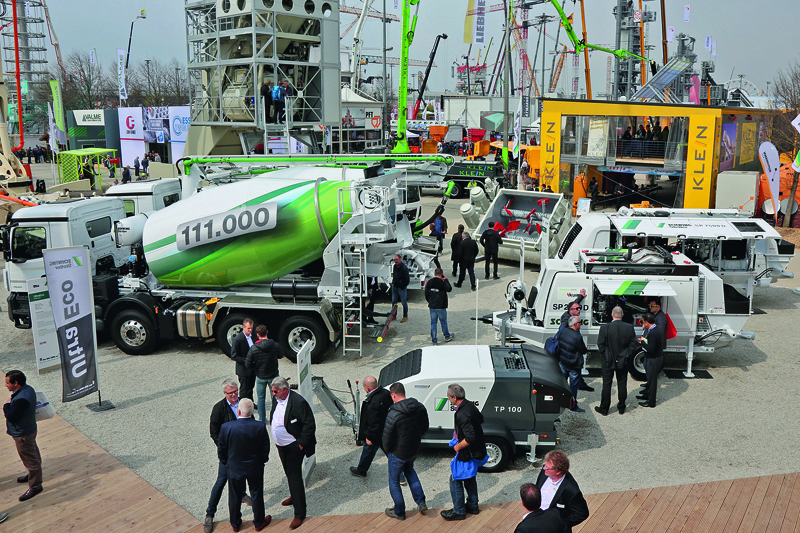 Den 111 000. Fahrmischer präsentierte Stetter mit einem zum Jubiläum passenden Design. Dass das Thema »Hybrid« auch in der Baumaschinenwelt angekommen ist, zeigte der Memminger Hersteller von Fahrmischern und Mischanlagen mit dem Fahrmischer AM 10 EDrive. Seine Mischtrommel kann bei der Beladung und Entladung wahlweise über den Dieselmotor des Fahrzeuges oder emissionsfrei über einen batteriebetriebenen Elektromotor angetrieben werden. Die Emissionsbelastung auf der Baustelle und an der Mischanlage sinkt deutlich. Wartungsarbeiten, bei denen sich die Trommel drehen muss, können ebenso ohne den Ausstoß von Schadstoffen in Werkstätten und Hallen durchgeführt werden.