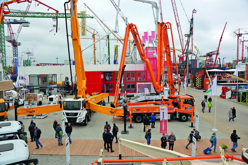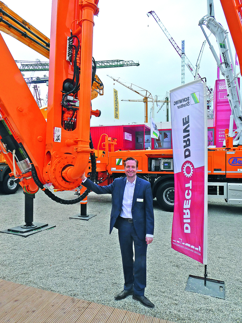 Schwing zeigte aus seinem breiten Autobetonpumpenprogramm unter anderem die neu entwickelte S 47 SX III, für die bereits auf der Messe zahlreiche Aufträge eingingen. Auch für das ebenfalls ausgestellte Flaggschiff, die S 65 SXF, gingen Aufträge ein. Die rund 63 t schwere Maschine war ein beliebtes Fotomotiv. Eine besondere Aufmerksamkeit erregte die S 36 X DirectDrive, die, so der Hersteller, mit ihren beiden DirectDrive-Antrieben am Mast so flexibel eingesetzt werden kann, wie keine andere Maschine in diese Klasse. So lässt sich das letzte Mastelement dank des von Schwing entwickelten DirectDrive-Hydraulikmotors 360° endlos drehen (das bauMAGAZIN berichtete bereits in Heft 4/19, Seite 252).